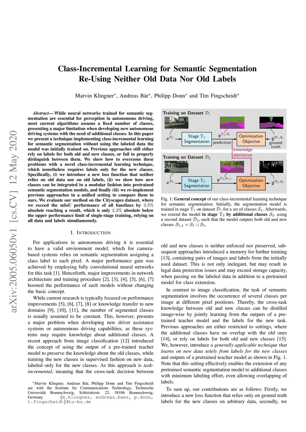 While neural networks trained for semantic segmentation are essential for perception in autonomous driving, most current algorithms assume a fixed number of classes, presenting a major limitation when developing new autonomous driving systems with the need of additional classes. In this paper we present a technique implementing class-incremental learning for semantic segmentation without using the labeled data the model was initially trained on. Previous approaches still either rely on labels for both old and new classes, or fail to properly distinguish between them. We show how to overcome these problems with a novel class-incremental learning technique, which nonetheless requires labels only for the new classes. Specifically, (i) we introduce a new loss function that neither relies on old data nor on old labels, (ii) we show how new classes can be integrated in a modular fashion into pretrained semantic segmentation models, and finally (iii) we re-implement previous approaches in a unified setting to compare them to ours. We evaluate our method on the Cityscapes dataset, where we exceed the mIoU performance of all baselines by 3.5% absolute reaching a result, which is only 2.2% absolute below the upper performance limit of single-stage training, relying on all data and labels simultaneously.