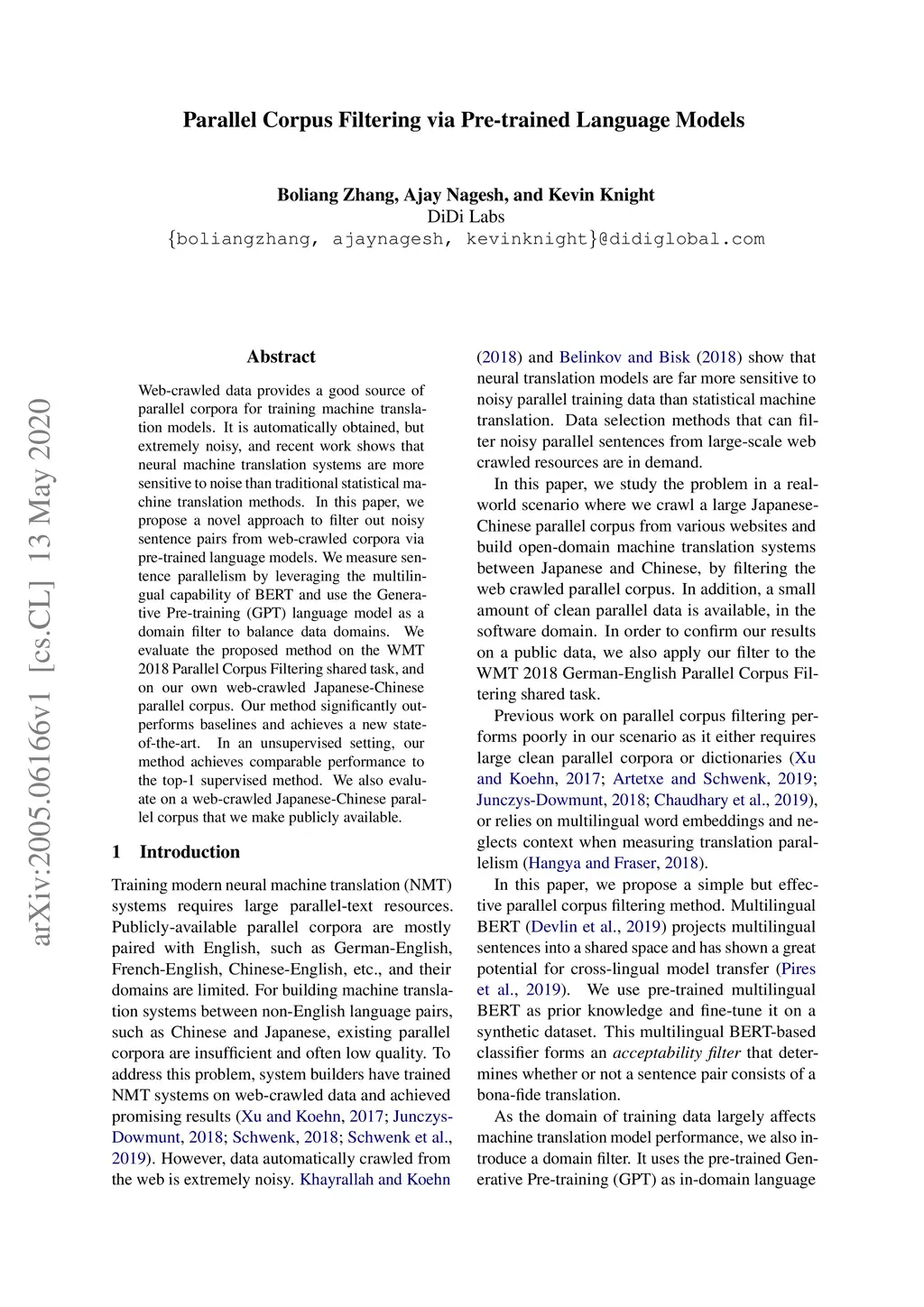Web-crawled data provides a good source of parallel corpora for training machine translation models. It is automatically obtained, but extremely noisy, and recent work shows that neural machine translation systems are more sensitive to noise than traditional statistical machine translation methods. In this paper, we propose a novel approach to filter out noisy sentence pairs from web-crawled corpora via pre-trained language models. We measure sentence parallelism by leveraging the multilingual capability of BERT and use the Generative Pre-training (GPT) language model as a domain filter to balance data domains. We evaluate the proposed method on the WMT 2018 Parallel Corpus Filtering shared task, and on our own web-crawled Japanese-Chinese parallel corpus. Our method significantly outperforms baselines and achieves a new state-of-the-art. In an unsupervised setting, our method achieves comparable performance to the top-1 supervised method. We also evaluate on a web-crawled Japanese-Chinese parallel corpus that we make publicly available.