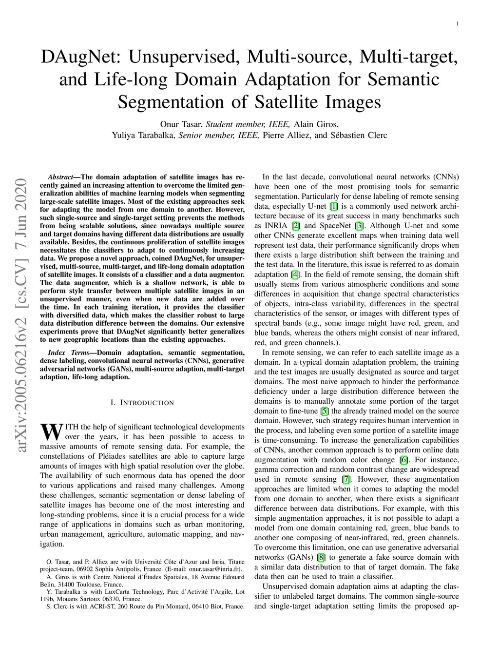 The domain adaptation of satellite images has recently gained an increasing attention to overcome the limited generalization abilities of machine learning models when segmenting large-scale satellite images. Most of the existing approaches seek for adapting the model from one domain to another. However, such single-source and single-target setting prevents the methods from being scalable solutions, since nowadays multiple source and target domains having different data distributions are usually available. Besides, the continuous proliferation of satellite images necessitates the classifiers to adapt to continuously increasing data. We propose a novel approach, coined DAugNet, for unsupervised, multi-source, multi-target, and life-long domain adaptation of satellite images. It consists of a classifier and a data augmentor. The data augmentor, which is a shallow network, is able to perform style transfer between multiple satellite images in an unsupervised manner, even when new data are added over the time. In each training iteration, it provides the classifier with diversified data, which makes the classifier robust to large data distribution difference between the domains. Our extensive experiments prove that DAugNet significantly better generalizes to new geographic locations than the existing approaches.