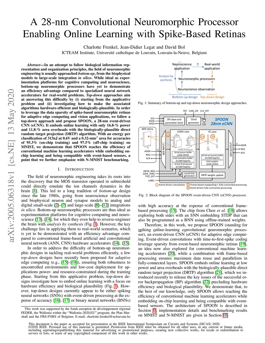 In an attempt to follow biological information representation and organization principles, the field of neuromorphic engineering is usually approached bottom-up, from the biophysical models to large-scale integration in silico. While ideal as experimentation platforms for cognitive computing and neuroscience, bottom-up neuromorphic processors have yet to demonstrate an efficiency advantage compared to specialized neural network accelerators for real-world problems. Top-down approaches aim at answering this difficulty by (i) starting from the applicative problem and (ii) investigating how to make the associated algorithms hardware-efficient and biologically-plausible. In order to leverage the data sparsity of spike-based neuromorphic retinas for adaptive edge computing and vision applications, we follow a top-down approach and propose SPOON, a 28-nm event-driven CNN (eCNN). It embeds online learning with only 16.8-% power and 11.8-% area overheads with the biologically-plausible direct random target projection (DRTP) algorithm. With an energy per classification of 313nJ at 0.6V and a 0.32-mm area for accuracies of 95.3% (on-chip training) and 97.5% (off-chip training) on MNIST, we demonstrate that SPOON reaches the efficiency of conventional machine learning accelerators while embedding on-chip learning and being compatible with event-based sensors, a point that we further emphasize with N-MNIST benchmarking.
