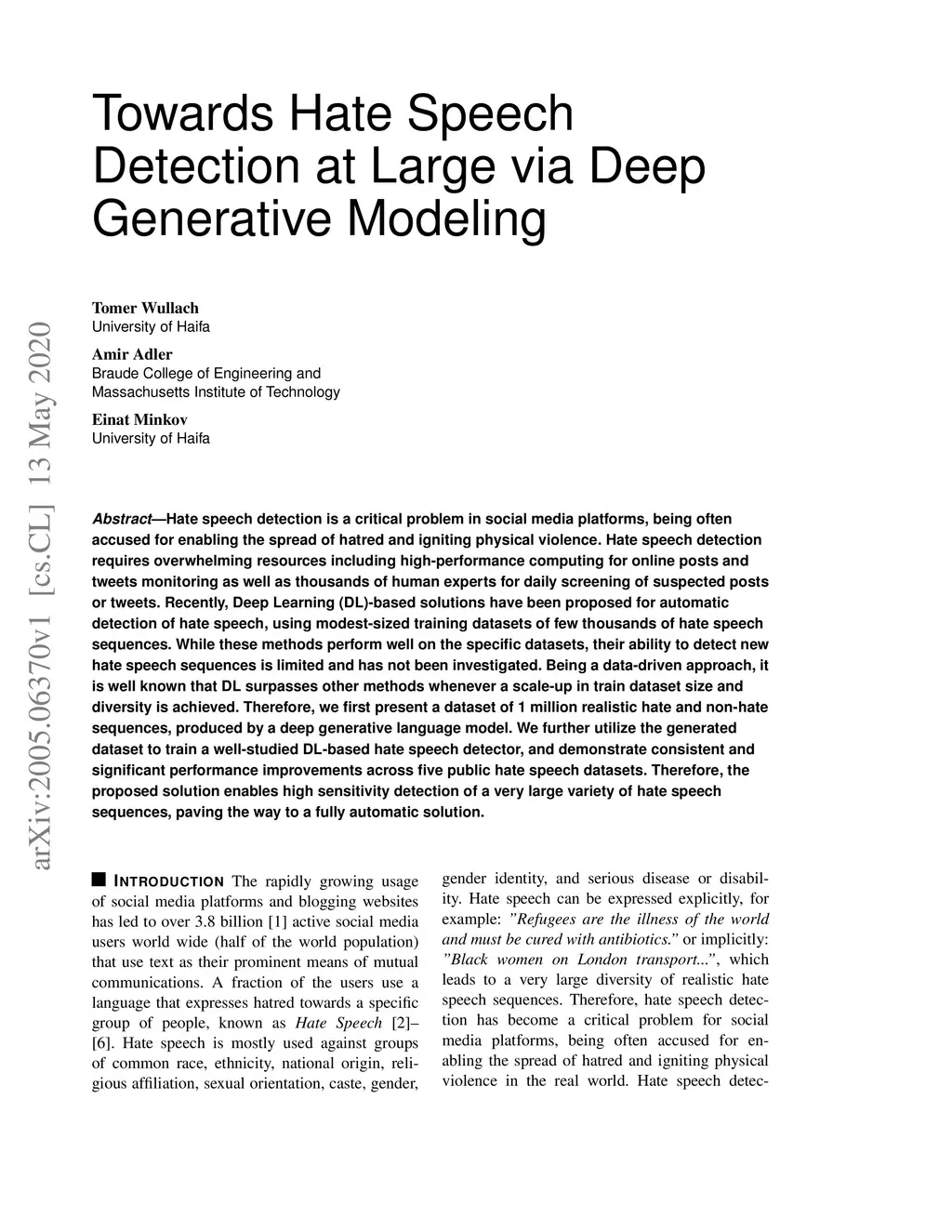 Towards Hate Speech Detection at Large via Deep Generative Modeling