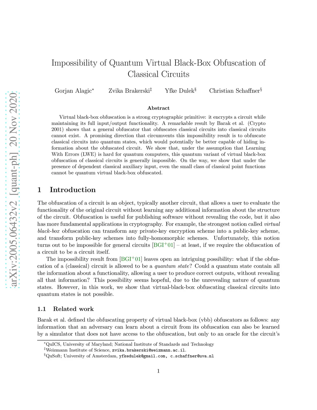 Virtual black-box obfuscation is a strong cryptographic primitive: it encrypts a circuit while maintaining its full input/output functionality. A remarkable result by Barak et al. (Crypto 2001) shows that a general obfuscator that obfuscates classical circuits into classical circuits cannot exist. A promising direction that circumvents this impossibility result is to obfuscate classical circuits into quantum states, which would potentially be better capable of hiding information about the obfuscated circuit. We show that, under the assumption that learning-with-errors (LWE) is hard for quantum computers, this quantum variant of virtual black-box obfuscation of classical circuits is generally impossible. On the way, we show that under the presence of dependent classical auxiliary input, even the small class of classical point functions cannot be quantum virtual black-box obfuscated.