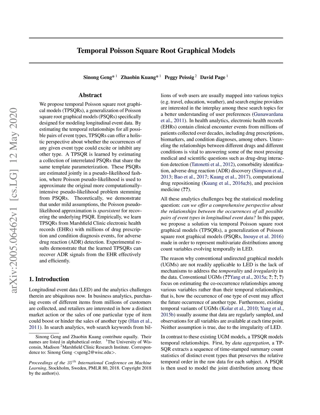 We propose temporal Poisson square root graphical models (TPSQRs), a generalization of Poisson square root graphical models (PSQRs) specifically designed for modeling longitudinal event data. By estimating the temporal relationships for all possible pairs of event types, TPSQRs can offer a holistic perspective about whether the occurrences of any given event type could excite or inhibit any other type. A TPSQR is learned by estimating a collection of interrelated PSQRs that share the same template parameterization. These PSQRs are estimated jointly in a pseudo-likelihood fashion, where Poisson pseudo-likelihood is used to approximate the original more computationally-intensive pseudo-likelihood problem stemming from PSQRs. Theoretically, we demonstrate that under mild assumptions, the Poisson pseudo-likelihood approximation is sparsistent for recovering the underlying PSQR. Empirically, we learn TPSQRs from Marshfield Clinic electronic health records (EHRs) with millions of drug prescription and condition diagnosis events, for adverse drug reaction (ADR) detection. Experimental results demonstrate that the learned TPSQRs can recover ADR signals from the EHR effectively and efficiently.