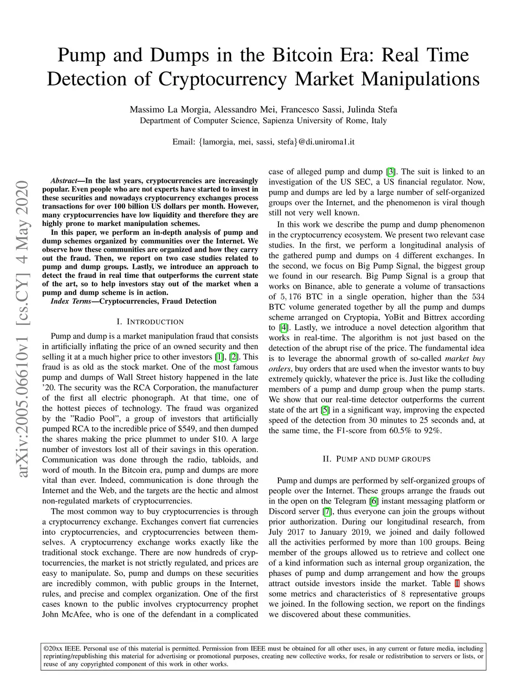 In the last years, cryptocurrencies are increasingly popular. Even people who are not experts have started to invest in these securities and nowadays cryptocurrency exchanges process transactions for over 100 billion US dollars per month. However, many cryptocurrencies have low liquidity and therefore they are highly prone to market manipulation schemes. In this paper, we perform an in-depth analysis of pump and dump schemes organized by communities over the Internet. We observe how these communities are organized and how they carry out the fraud. Then, we report on two case studies related to pump and dump groups. Lastly, we introduce an approach to detect the fraud in real time that outperforms the current state of the art, so to help investors stay out of the market when a pump and dump scheme is in action.