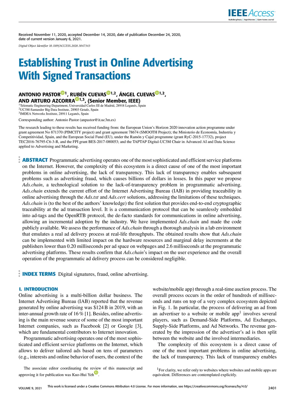 Programmatic advertising operates one of the most sophisticated and efficient service platforms on the Internet. However, the complexity of this ecosystem is a direct cause of one of the most important problems in online advertising, the lack of transparency. This lack of transparency enables subsequent problems such as advertising fraud, which causes billions of dollars in losses. In this paper we propose Ads.chain, a technological solution to the lack-of-transparency problem in programmatic advertising. Ads.chain extends the current effort of the Internet Advertising Bureau (IAB) in providing traceability in online advertising through the Ads.txt and Ads.cert solutions, addressing the limitations of these techniques. Ads.chain is (to the best of the authors' knowledge) the first solution that provides end-to-end cryptographic traceability at the ad transaction level. It is a communication protocol that can be seamlessly embedded into ad-tags and the OpenRTB protocol, the de-facto standards for communications in online advertising, allowing an incremental adoption by the industry. We have implemented Ads.chain and made the code publicly available. We assess the performance of Ads.chain through a thorough analysis in a lab environment that emulates a real ad delivery process at real-life throughputs. The obtained results show that Ads.chain can be implemented with limited impact on the hardware resources and marginal delay increments at the publishers lower than 0.20 milliseconds per ad space on webpages and 2.6 milliseconds at the programmatic advertising platforms. These results confirm that Ads.chain's impact on the user experience and the overall operation of the programmatic ad delivery process can be considered negligible.