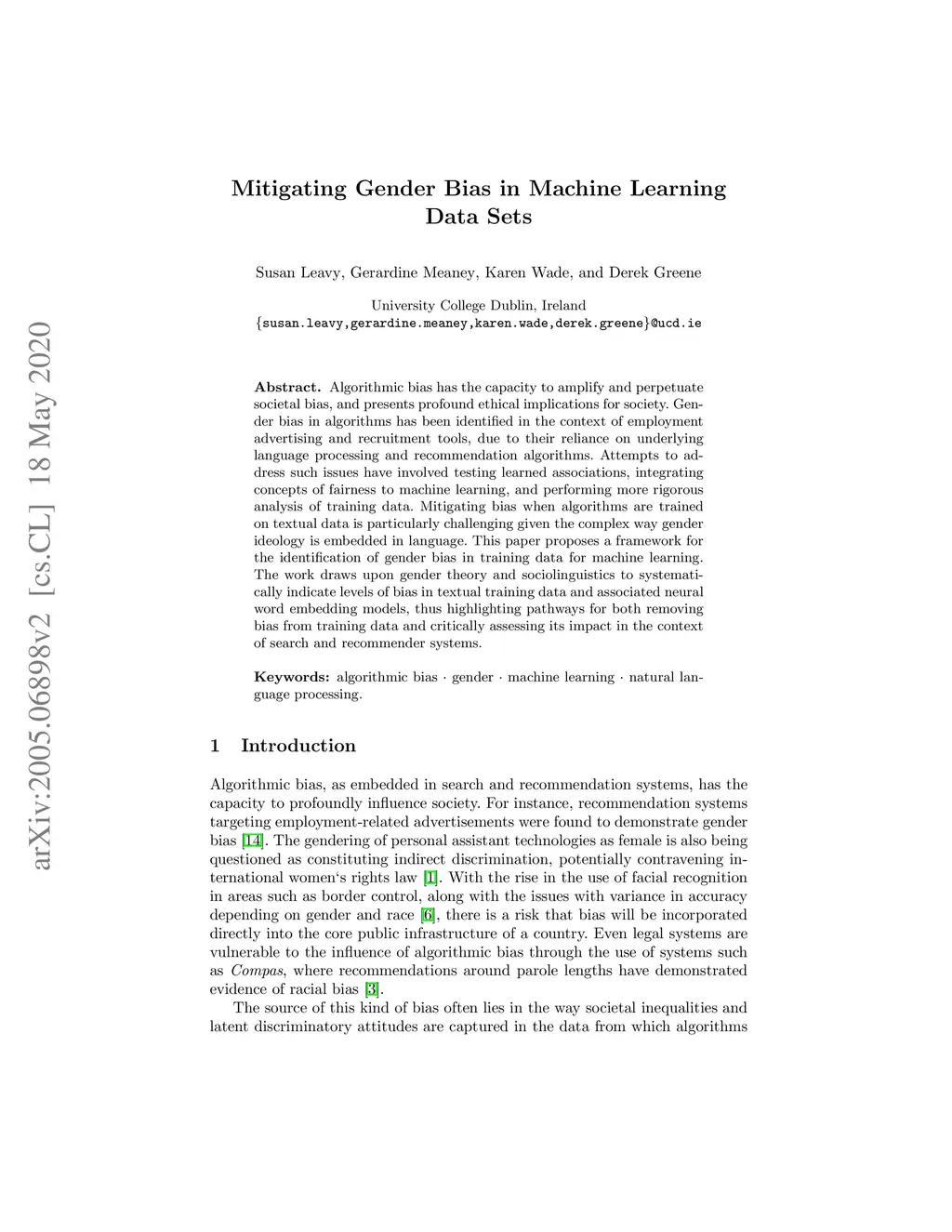 Artificial Intelligence has the capacity to amplify and perpetuate societal biases and presents profound ethical implications for society. Gender bias has been identified in the context of employment advertising and recruitment tools, due to their reliance on underlying language processing and recommendation algorithms. Attempts to address such issues have involved testing learned associations, integrating concepts of fairness to machine learning and performing more rigorous analysis of training data. Mitigating bias when algorithms are trained on textual data is particularly challenging given the complex way gender ideology is embedded in language. This paper proposes a framework for the identification of gender bias in training data for machine learning.The work draws upon gender theory and sociolinguistics to systematically indicate levels of bias in textual training data and associated neural word embedding models, thus highlighting pathways for both removing bias from training data and critically assessing its impact.