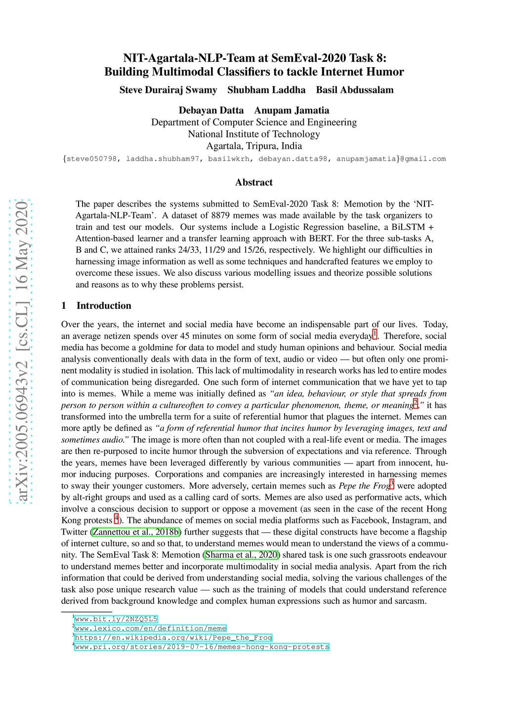 The paper describes the systems submitted to SemEval-2020 Task 8: Memotion by the `NIT-Agartala-NLP-Team'. A dataset of 8879 memes was made available by the task organizers to train and test our models. Our systems include a Logistic Regression baseline, a BiLSTM + Attention-based learner and a transfer learning approach with BERT. For the three sub-tasks A, B and C, we attained ranks 24/33, 11/29 and 15/26, respectively. We highlight our difficulties in harnessing image information as well as some techniques and handcrafted features we employ to overcome these issues. We also discuss various modelling issues and theorize possible solutions and reasons as to why these problems persist.