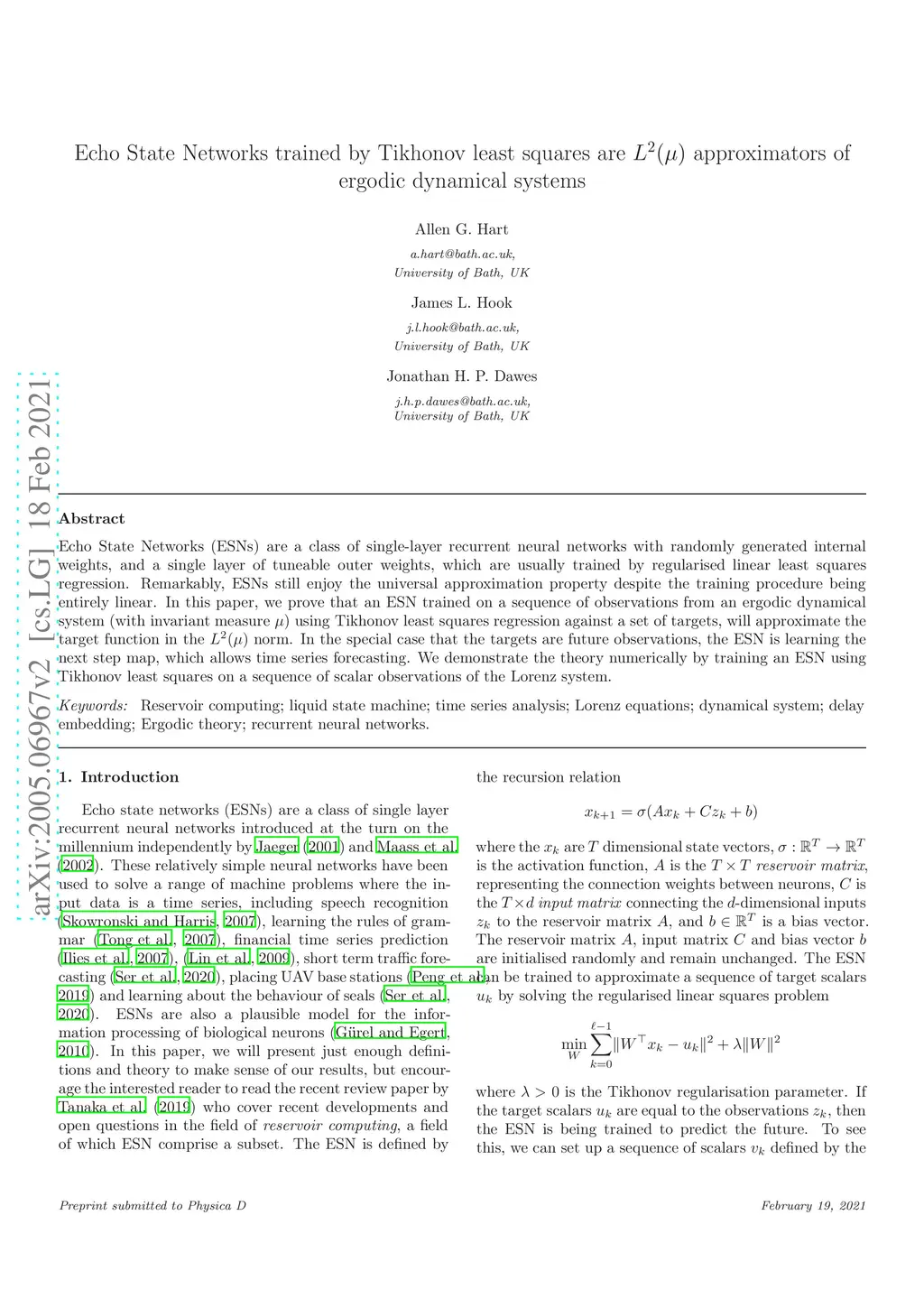 Echo State Networks (ESNs) are a class of single-layer recurrent neural networks with randomly generated internal weights, and a single layer of tuneable outer weights, which are usually trained by regularised linear least squares regression. Remarkably, ESNs still enjoy the universal approximation property despite the training procedure being entirely linear. In this paper, we prove that an ESN trained on a sequence of observations from an ergodic dynamical system (with invariant measure ) using Tikhonov least squares regression against a set of targets, will approximate the target function in the norm. In the special case that the targets are future observations, the ESN is learning the next step map, which allows time series forecasting. We demonstrate the theory numerically by training an ESN using Tikhonov least squares on a sequence of scalar observations of the Lorenz system.
