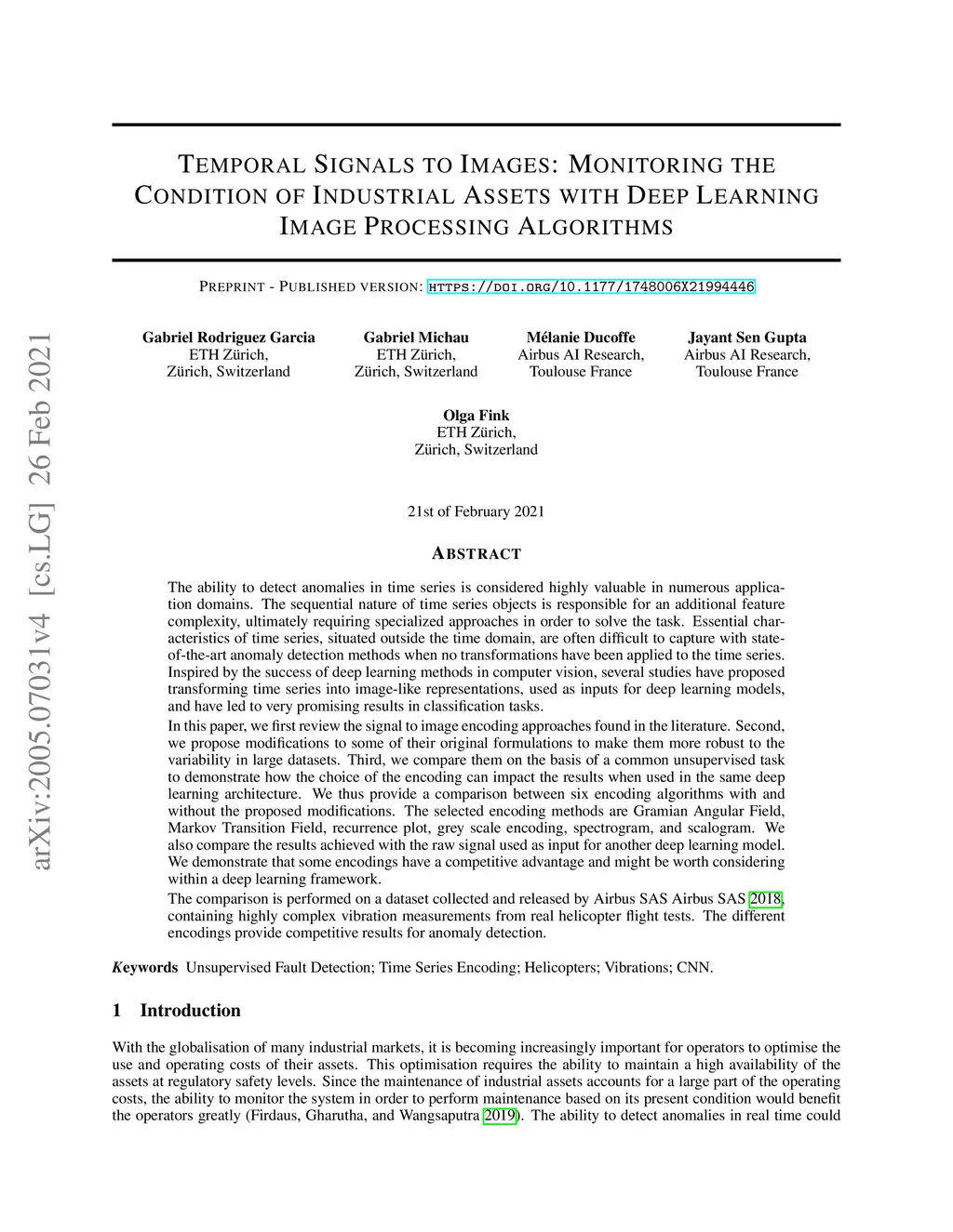 The ability to detect anomalies in time series is considered highly valuable in numerous application domains. The sequential nature of time series objects is responsible for an additional feature complexity, ultimately requiring specialized approaches in order to solve the task. Essential characteristics of time series, situated outside the time domain, are often difficult to capture with state-of-the-art anomaly detection methods when no transformations have been applied to the time series. Inspired by the success of deep learning methods in computer vision, several studies have proposed transforming time series into image-like representations, used as inputs for deep learning models, and have led to very promising results in classification tasks. In this paper, we first review the signal to image encoding approaches found in the literature. Second, we propose modifications to some of their original formulations to make them more robust to the variability in large datasets. Third, we compare them on the basis of a common unsupervised task to demonstrate how the choice of the encoding can impact the results when used in the same deep learning architecture. We thus provide a comparison between six encoding algorithms with and without the proposed modifications. The selected encoding methods are Gramian Angular Field, Markov Transition Field, recurrence plot, grey scale encoding, spectrogram, and scalogram. We also compare the results achieved with the raw signal used as input for another deep learning model. We demonstrate that some encodings have a competitive advantage and might be worth considering within a deep learning framework. The comparison is performed on a dataset collected and released by Airbus SAS, containing highly complex vibration measurements from real helicopter flight tests. The different encodings provide competitive results for anomaly detection.