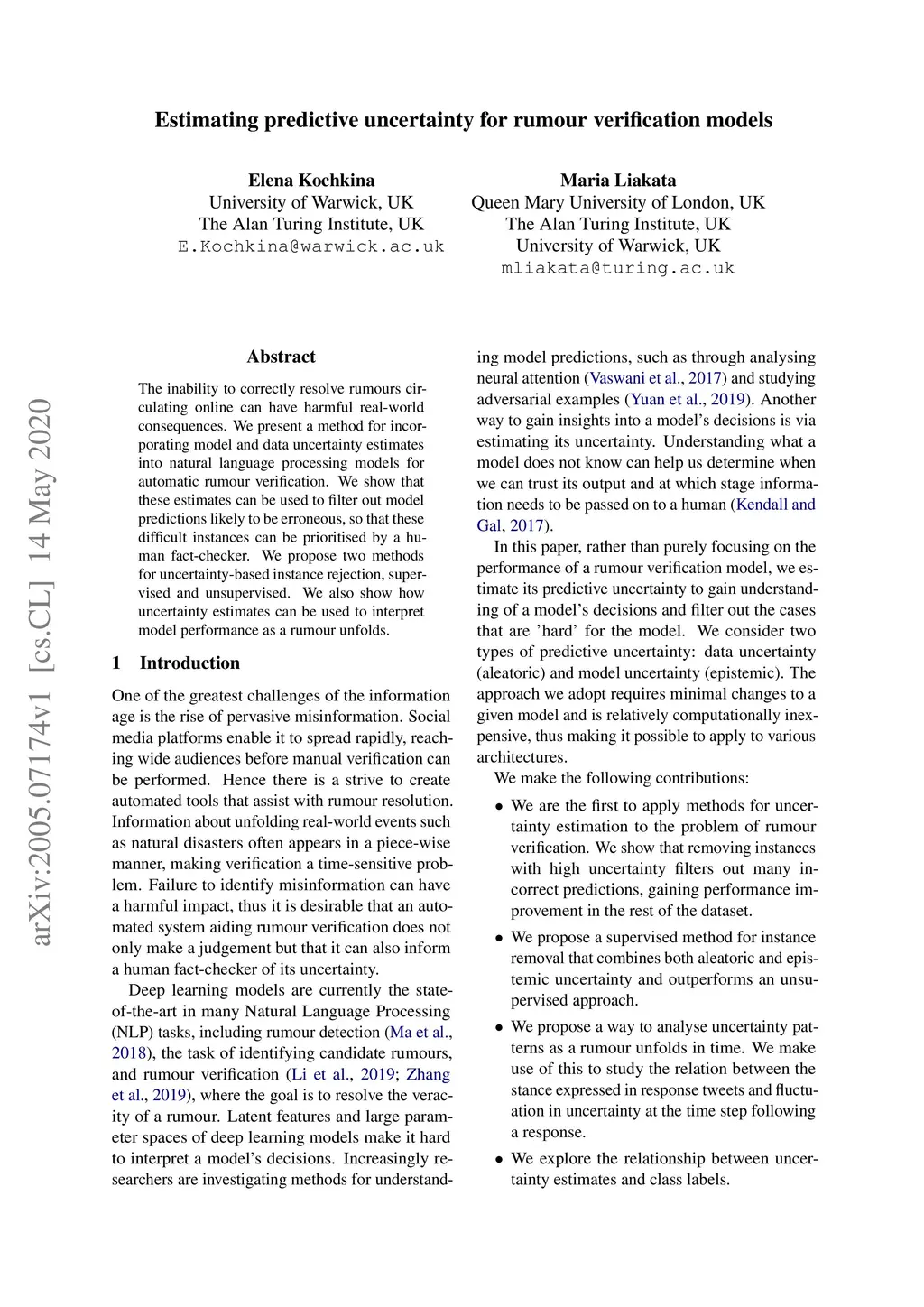 The inability to correctly resolve rumours circulating online can have harmful real-world consequences. We present a method for incorporating model and data uncertainty estimates into natural language processing models for automatic rumour verification. We show that these estimates can be used to filter out model predictions likely to be erroneous, so that these difficult instances can be prioritised by a human fact-checker. We propose two methods for uncertainty-based instance rejection, supervised and unsupervised. We also show how uncertainty estimates can be used to interpret model performance as a rumour unfolds.