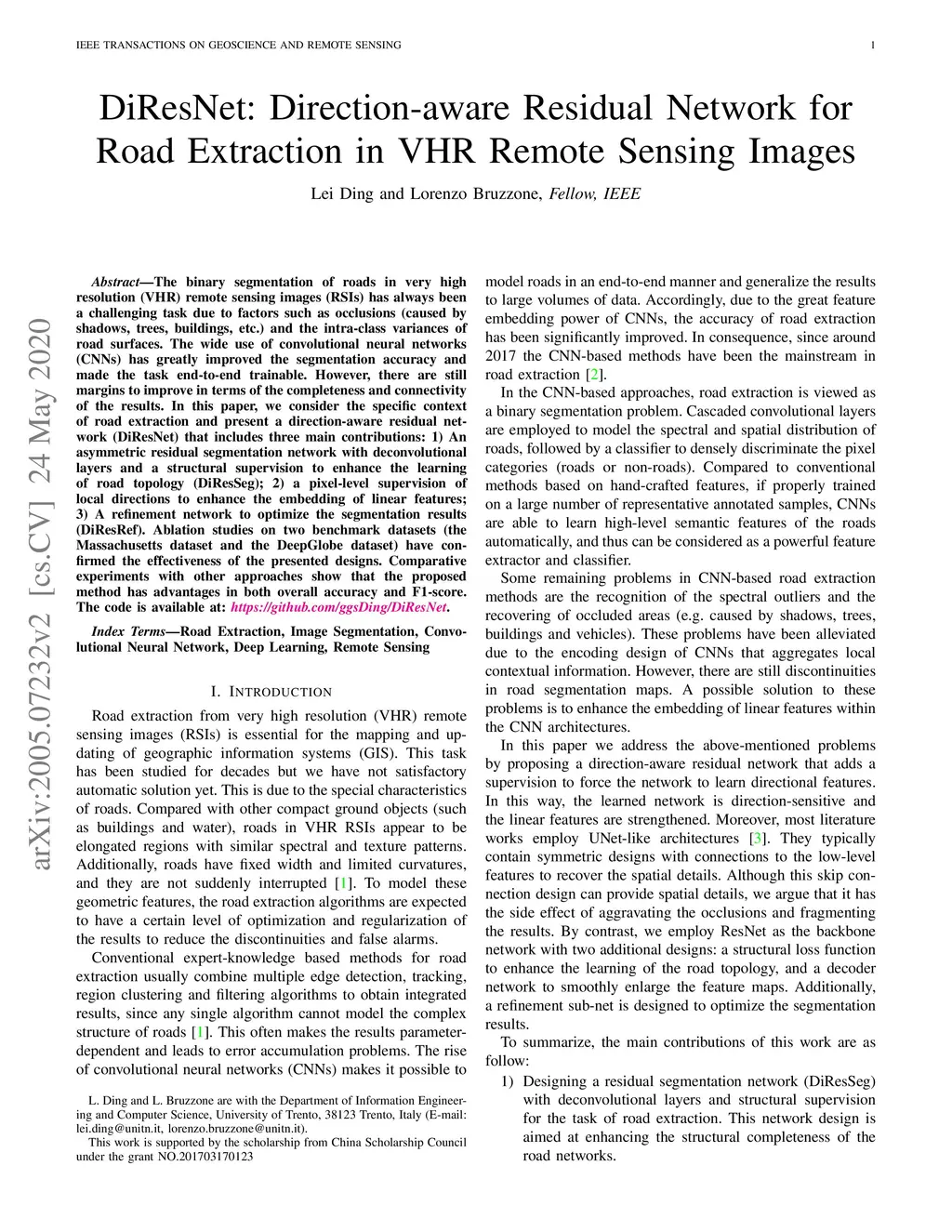 DiResNet: Direction-aware Residual Network for Road Extraction in VHR