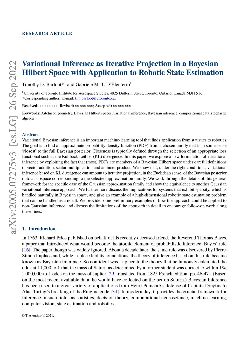 Variational Bayesian inference is an important machine-learning tool that finds application from statistics to robotics. The goal is to find an approximate probability density function (PDF) from a chosen family that is in some sense 'closest' to the full Bayesian posterior. Closeness is typically defined through the selection of an appropriate loss functional such as the Kullback-Leibler (KL) divergence. In this paper, we explore a new formulation of variational inference by exploiting the fact that (most) PDFs are members of a Bayesian Hilbert space under careful definitions of vector addition, scalar multiplication and an inner product. We show that, under the right conditions, variational inference based on KL divergence can amount to iterative projection, in the Euclidean sense, of the Bayesian posterior onto a subspace corresponding to the selected approximation family. We work through the details of this general framework for the specific case of the Gaussian approximation family and show the equivalence to another Gaussian variational inference approach. We furthermore discuss the implications for systems that exhibit sparsity, which is handled naturally in Bayesian space, and give an example of a high-dimensional robotic state estimation problem that can be handled as a result. We provide some preliminary examples of how the approach could be applied to non-Gaussian inference and discuss the limitations of the approach in detail to encourage follow-on work along these lines.