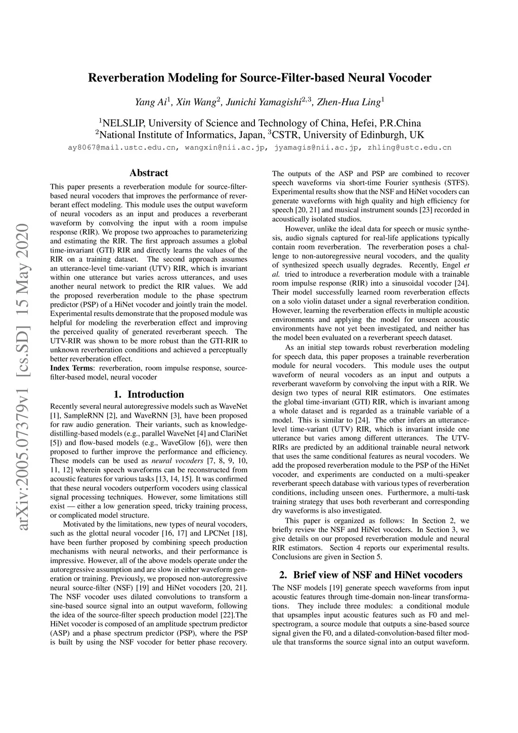 This paper presents a reverberation module for source-filter-based neural vocoders that improves the performance of reverberant effect modeling. This module uses the output waveform of neural vocoders as an input and produces a reverberant waveform by convolving the input with a room impulse response (RIR). We propose two approaches to parameterizing and estimating the RIR. The first approach assumes a global time-invariant (GTI) RIR and directly learns the values of the RIR on a training dataset. The second approach assumes an utterance-level time-variant (UTV) RIR, which is invariant within one utterance but varies across utterances, and uses another neural network to predict the RIR values. We add the proposed reverberation module to the phase spectrum predictor (PSP) of a HiNet vocoder and jointly train the model. Experimental results demonstrate that the proposed module was helpful for modeling the reverberation effect and improving the perceived quality of generated reverberant speech. The UTV-RIR was shown to be more robust than the GTI-RIR to unknown reverberation conditions and achieved a perceptually better reverberation effect.