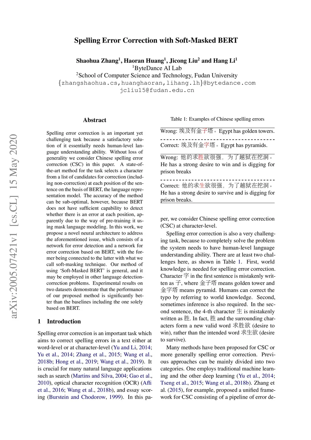 Spelling error correction is an important yet challenging task because a satisfactory solution of it essentially needs human-level language understanding ability. Without loss of generality we consider Chinese spelling error correction (CSC) in this paper. A state-of-the-art method for the task selects a character from a list of candidates for correction (including non-correction) at each position of the sentence on the basis of BERT, the language representation model. The accuracy of the method can be sub-optimal, however, because BERT does not have sufficient capability to detect whether there is an error at each position, apparently due to the way of pre-training it using mask language modeling. In this work, we propose a novel neural architecture to address the aforementioned issue, which consists of a network for error detection and a network for error correction based on BERT, with the former being connected to the latter with what we call soft-masking technique. Our method of using `Soft-Masked BERT' is general, and it may be employed in other language detection-correction problems. Experimental results on two datasets demonstrate that the performance of our proposed method is significantly better than the baselines including the one solely based on BERT.
