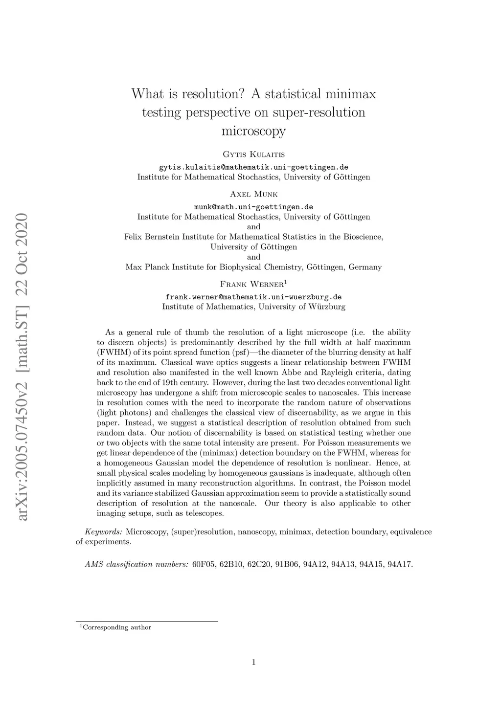 As a general rule of thumb the resolution of a light microscope (i.e. the ability to discern objects) is predominantly described by the full width at half maximum (FWHM) of its point spread function (psf)---the diameter of the blurring density at half of its maximum. Classical wave optics suggests a linear relationship between FWHM and resolution also manifested in the well known Abbe and Rayleigh criteria, dating back to the end of 19th century. However, during the last two decades conventional light microscopy has undergone a shift from microscopic scales to nanoscales. This increase in resolution comes with the need to incorporate the random nature of observations (light photons) and challenges the classical view of discernability, as we argue in this paper. Instead, we suggest a statistical description of resolution obtained from such random data. Our notion of discernability is based on statistical testing whether one or two objects with the same total intensity are present. For Poisson measurements we get linear dependence of the (minimax) detection boundary on the FWHM, whereas for a homogeneous Gaussian model the dependence of resolution is nonlinear. Hence, at small physical scales modeling by homogeneous gaussians is inadequate, although often implicitly assumed in many reconstruction algorithms. In contrast, the Poisson model and its variance stabilized Gaussian approximation seem to provide a statistically sound description of resolution at the nanoscale. Our theory is also applicable to other imaging setups, such as telescopes.