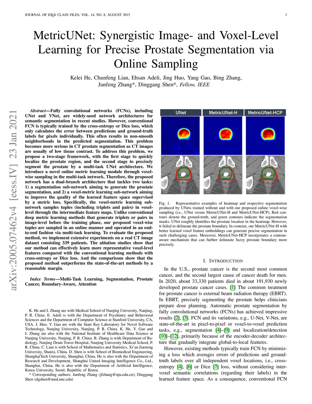 Fully convolutional networks (FCNs), including UNet and VNet, are widely-used network architectures for semantic segmentation in recent studies. However, conventional FCN is typically trained by the cross-entropy or Dice loss, which only calculates the error between predictions and ground-truth labels for pixels individually. This often results in non-smooth neighborhoods in the predicted segmentation. To address this problem, we propose a two-stage framework, with the first stage to quickly localize the prostate region and the second stage to precisely segment the prostate by a multi-task UNet architecture. We introduce a novel online metric learning module through voxel-wise sampling in the multi-task network. Therefore, the proposed network has a dual-branch architecture that tackles two tasks: 1) a segmentation sub-network aiming to generate the prostate segmentation, and 2) a voxel-metric learning sub-network aiming to improve the quality of the learned feature space supervised by a metric loss. Specifically, the voxel-metric learning sub-network samples tuples (including triplets and pairs) in voxel-level through the intermediate feature maps. Unlike conventional deep metric learning methods that generate triplets or pairs in image-level before the training phase, our proposed voxel-wise tuples are sampled in an online manner and operated in an end-to-end fashion via multi-task learning. To evaluate the proposed method, we implement extensive experiments on a real CT image dataset consisting of 339 patients. The ablation studies show that our method can effectively learn more representative voxel-level features compared with the conventional learning methods with cross-entropy or Dice loss. And the comparisons show that the proposed method outperforms the state-of-the-art methods by a reasonable margin.