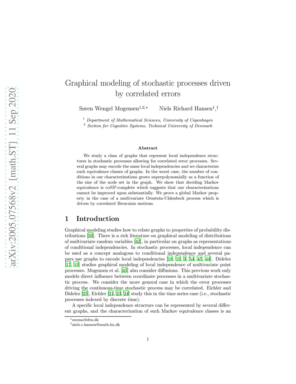 We study a class of graphs that represent local independence structures in stochastic processes allowing for correlated error processes. Several graphs may encode the same local independencies and we characterize such equivalence classes of graphs. In the worst case, the number of conditions in our characterizations grows superpolynomially as a function of the size of the node set in the graph. We show that deciding Markov equivalence is coNP-complete which suggests that our characterizations cannot be improved upon substantially. We prove a global Markov property in the case of a multivariate Ornstein-Uhlenbeck process which is driven by correlated Brownian motions.
