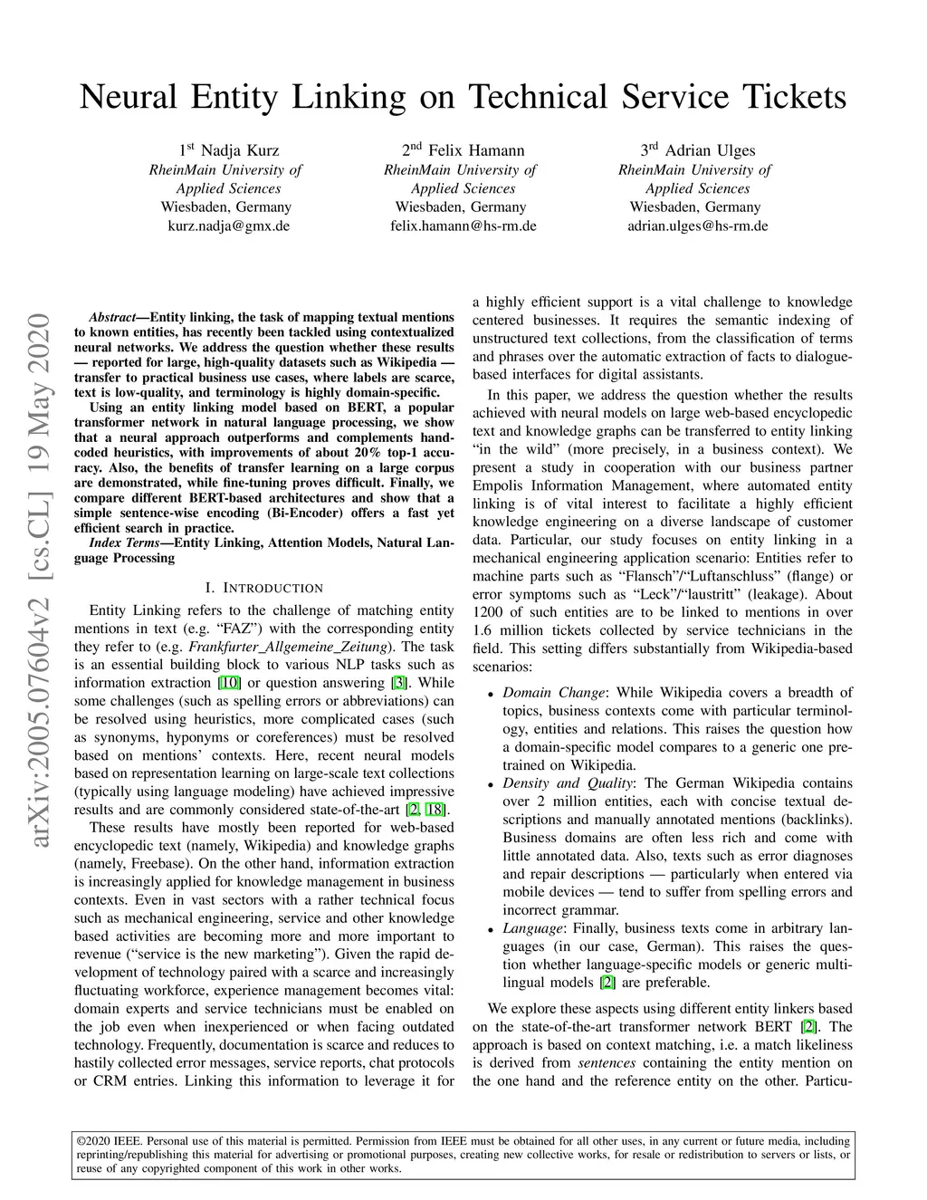 Entity linking, the task of mapping textual mentions to known entities, has recently been tackled using contextualized neural networks. We address the question whether these results -- reported for large, high-quality datasets such as Wikipedia -- transfer to practical business use cases, where labels are scarce, text is low-quality, and terminology is highly domain-specific. Using an entity linking model based on BERT, a popular transformer network in natural language processing, we show that a neural approach outperforms and complements hand-coded heuristics, with improvements of about 20% top-1 accuracy. Also, the benefits of transfer learning on a large corpus are demonstrated, while fine-tuning proves difficult. Finally, we compare different BERT-based architectures and show that a simple sentence-wise encoding (Bi-Encoder) offers a fast yet efficient search in practice.