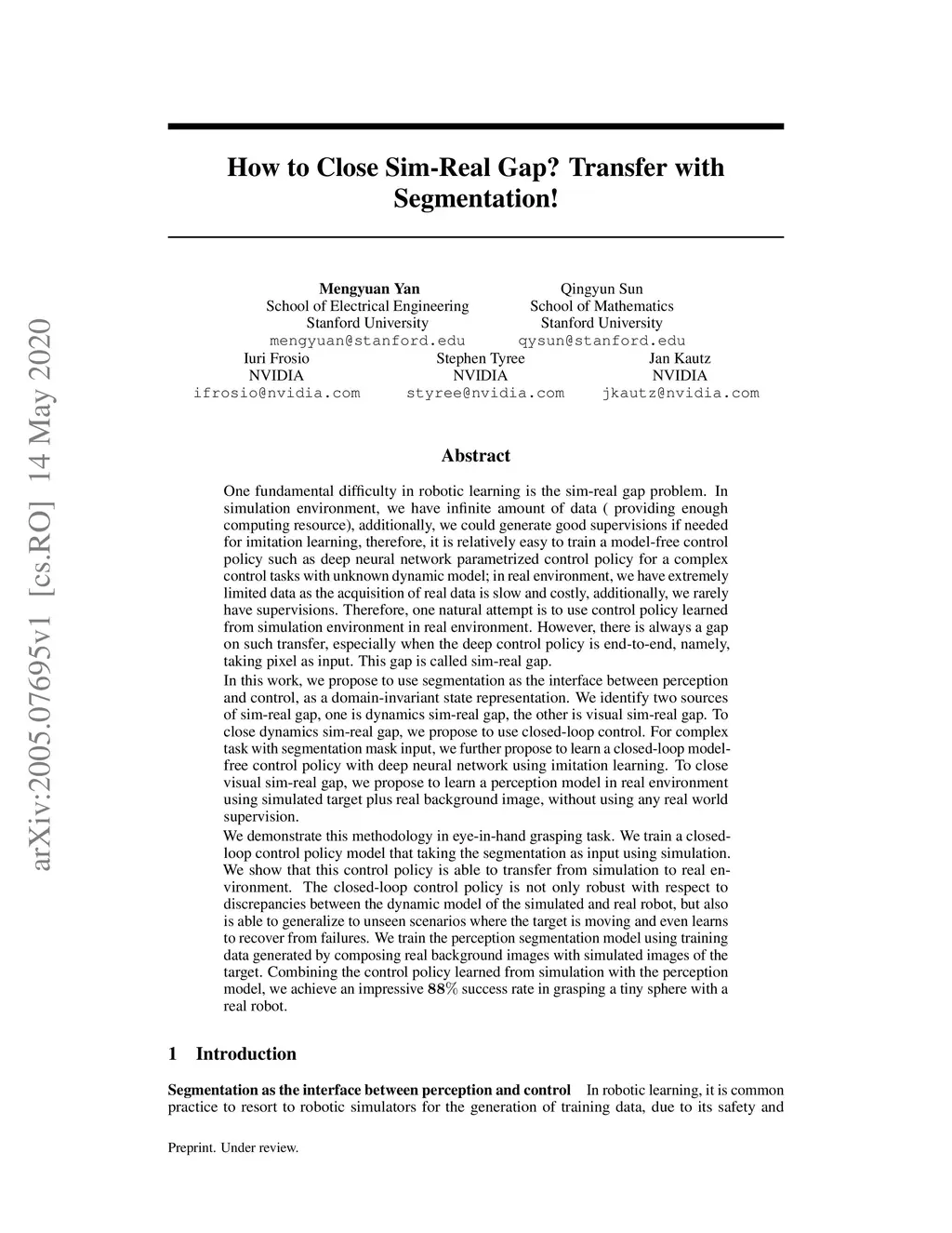 One fundamental difficulty in robotic learning is the sim-real gap problem. In this work, we propose to use segmentation as the interface between perception and control, as a domain-invariant state representation. We identify two sources of sim-real gap, one is dynamics sim-real gap, the other is visual sim-real gap. To close dynamics sim-real gap, we propose to use closed-loop control. For complex task with segmentation mask input, we further propose to learn a closed-loop model-free control policy with deep neural network using imitation learning. To close visual sim-real gap, we propose to learn a perception model in real environment using simulated target plus real background image, without using any real world supervision. We demonstrate this methodology in eye-in-hand grasping task. We train a closed-loop control policy model that taking the segmentation as input using simulation. We show that this control policy is able to transfer from simulation to real environment. The closed-loop control policy is not only robust with respect to discrepancies between the dynamic model of the simulated and real robot, but also is able to generalize to unseen scenarios where the target is moving and even learns to recover from failures. We train the perception segmentation model using training data generated by composing real background images with simulated images of the target. Combining the control policy learned from simulation with the perception model, we achieve an impressive success rate in grasping a tiny sphere with a real robot.