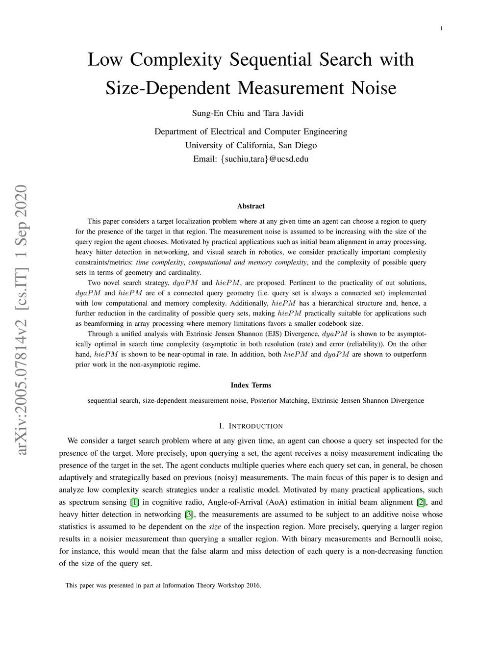 Low Complexity Sequential Search with Size-Dependent Measurement Noise