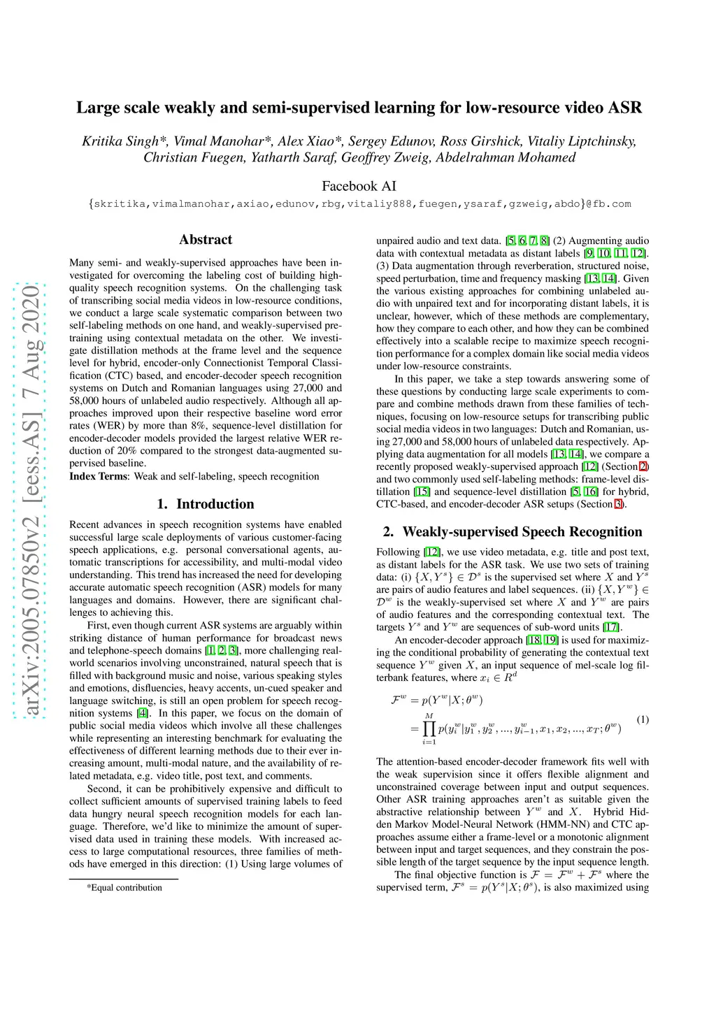 Many semi- and weakly-supervised approaches have been investigated for overcoming the labeling cost of building high quality speech recognition systems. On the challenging task of transcribing social media videos in low-resource conditions, we conduct a large scale systematic comparison between two self-labeling methods on one hand, and weakly-supervised pretraining using contextual metadata on the other. We investigate distillation methods at the frame level and the sequence level for hybrid, encoder-only CTC-based, and encoder-decoder speech recognition systems on Dutch and Romanian languages using 27,000 and 58,000 hours of unlabeled audio respectively. Although all approaches improved upon their respective baseline WERs by more than 8%, sequence-level distillation for encoder-decoder models provided the largest relative WER reduction of 20% compared to the strongest data-augmented supervised baseline.