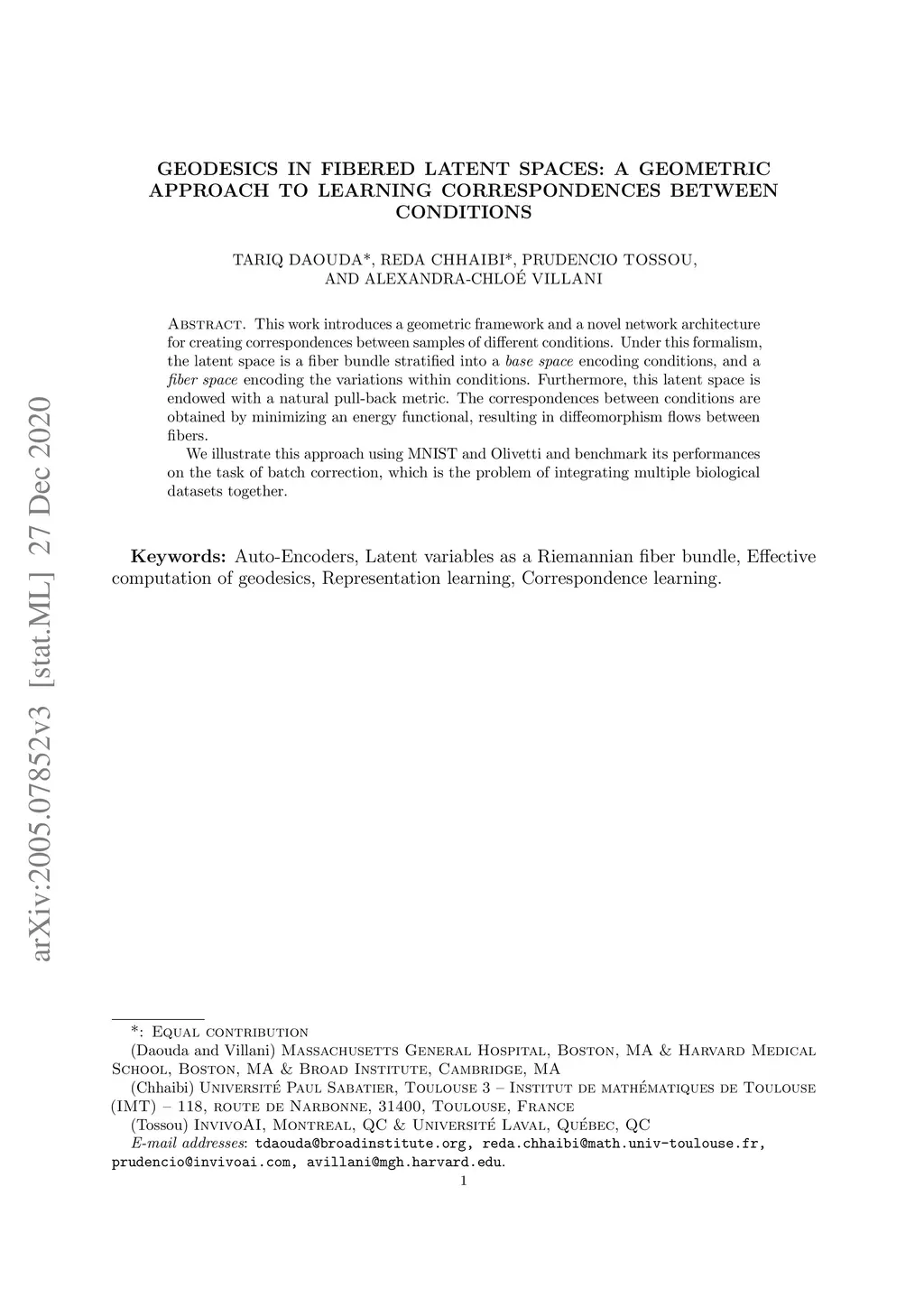 This work introduces a geometric framework and a novel network architecture for creating correspondences between samples of different conditions. Under this formalism, the latent space is a fiber bundle stratified into a base space encoding conditions, and a fiber space encoding the variations within conditions. Furthermore, this latent space is endowed with a natural pull-back metric. The correspondences between conditions are obtained by minimizing an energy functional, resulting in diffeomorphism flows between fibers. We illustrate this approach using MNIST and Olivetti and benchmark its performances on the task of batch correction, which is the problem of integrating multiple biological datasets together.