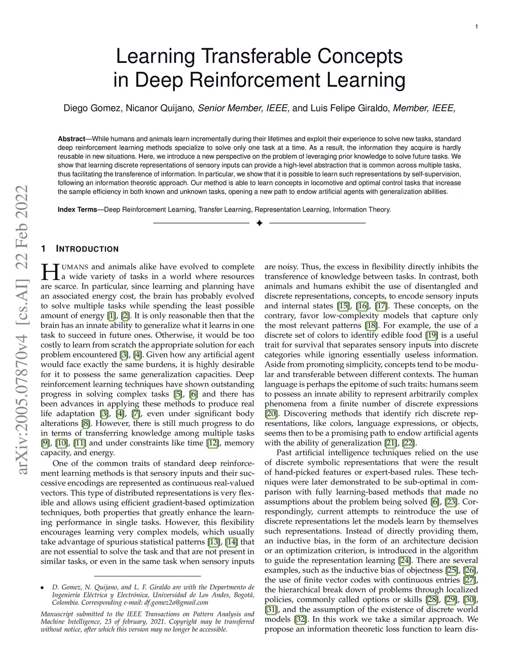 While humans and animals learn incrementally during their lifetimes and exploit their experience to solve new tasks, standard deep reinforcement learning methods specialize to solve only one task at a time. As a result, the information they acquire is hardly reusable in new situations. Here, we introduce a new perspective on the problem of leveraging prior knowledge to solve future tasks. We show that learning discrete representations of sensory inputs can provide a high-level abstraction that is common across multiple tasks, thus facilitating the transference of information. In particular, we show that it is possible to learn such representations by self-supervision, following an information theoretic approach. Our method is able to learn concepts in locomotive and optimal control tasks that increase the sample efficiency in both known and unknown tasks, opening a new path to endow artificial agents with generalization abilities.