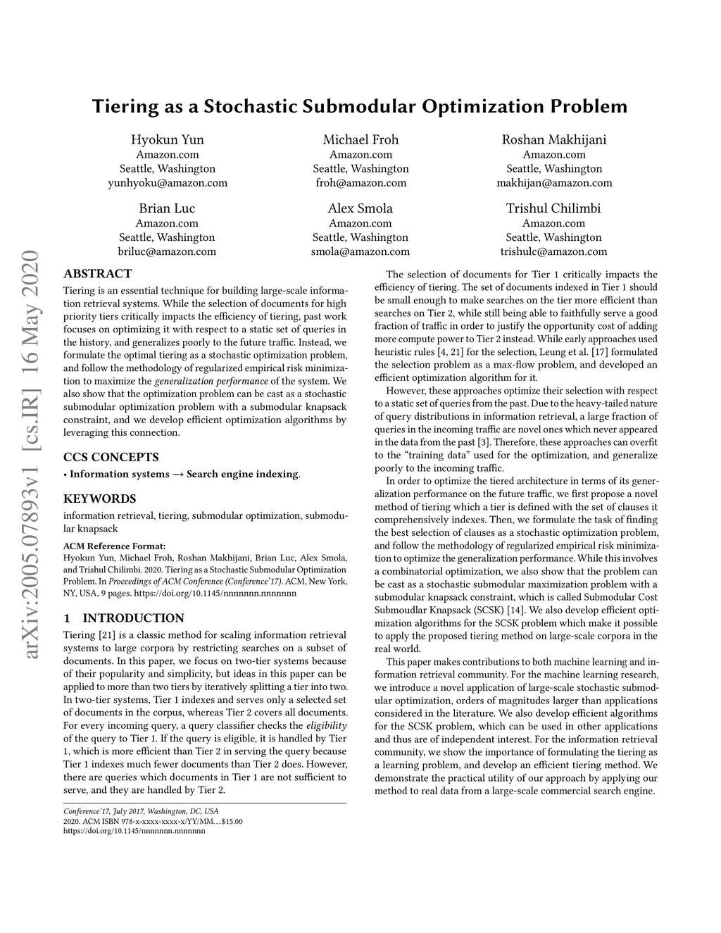 Tiering is an essential technique for building large-scale information retrieval systems. While the selection of documents for high priority tiers critically impacts the efficiency of tiering, past work focuses on optimizing it with respect to a static set of queries in the history, and generalizes poorly to the future traffic. Instead, we formulate the optimal tiering as a stochastic optimization problem, and follow the methodology of regularized empirical risk minimization to maximize the \emph{generalization performance} of the system. We also show that the optimization problem can be cast as a stochastic submodular optimization problem with a submodular knapsack constraint, and we develop efficient optimization algorithms by leveraging this connection.