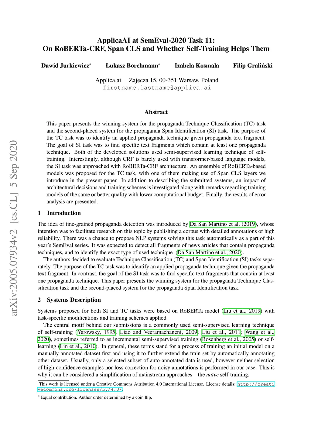 This paper presents the winning system for the propaganda Technique Classification (TC) task and the second-placed system for the propaganda Span Identification (SI) task. The purpose of TC task was to identify an applied propaganda technique given propaganda text fragment. The goal of SI task was to find specific text fragments which contain at least one propaganda technique. Both of the developed solutions used semi-supervised learning technique of self-training. Interestingly, although CRF is barely used with transformer-based language models, the SI task was approached with RoBERTa-CRF architecture. An ensemble of RoBERTa-based models was proposed for the TC task, with one of them making use of Span CLS layers we introduce in the present paper. In addition to describing the submitted systems, an impact of architectural decisions and training schemes is investigated along with remarks regarding training models of the same or better quality with lower computational budget. Finally, the results of error analysis are presented.