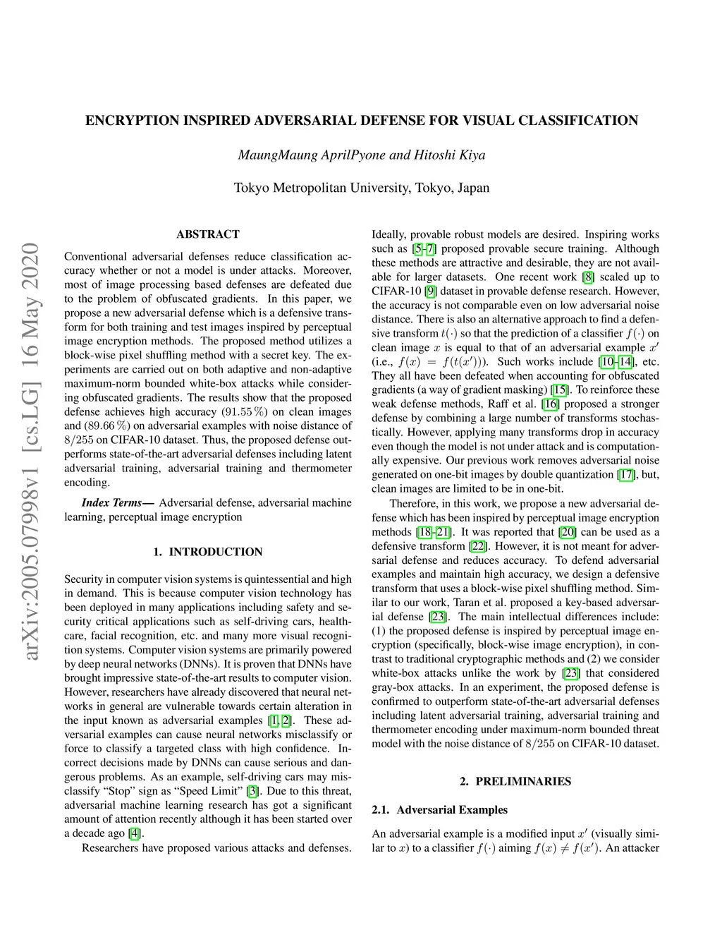 Conventional adversarial defenses reduce classification accuracy whether or not a model is under attacks. Moreover, most of image processing based defenses are defeated due to the problem of obfuscated gradients. In this paper, we propose a new adversarial defense which is a defensive transform for both training and test images inspired by perceptual image encryption methods. The proposed method utilizes a block-wise pixel shuffling method with a secret key. The experiments are carried out on both adaptive and non-adaptive maximum-norm bounded white-box attacks while considering obfuscated gradients. The results show that the proposed defense achieves high accuracy (91.55 %) on clean images and (89.66 %) on adversarial examples with noise distance of 8/255 on CIFAR-10 dataset. Thus, the proposed defense outperforms state-of-the-art adversarial defenses including latent adversarial training, adversarial training and thermometer encoding.