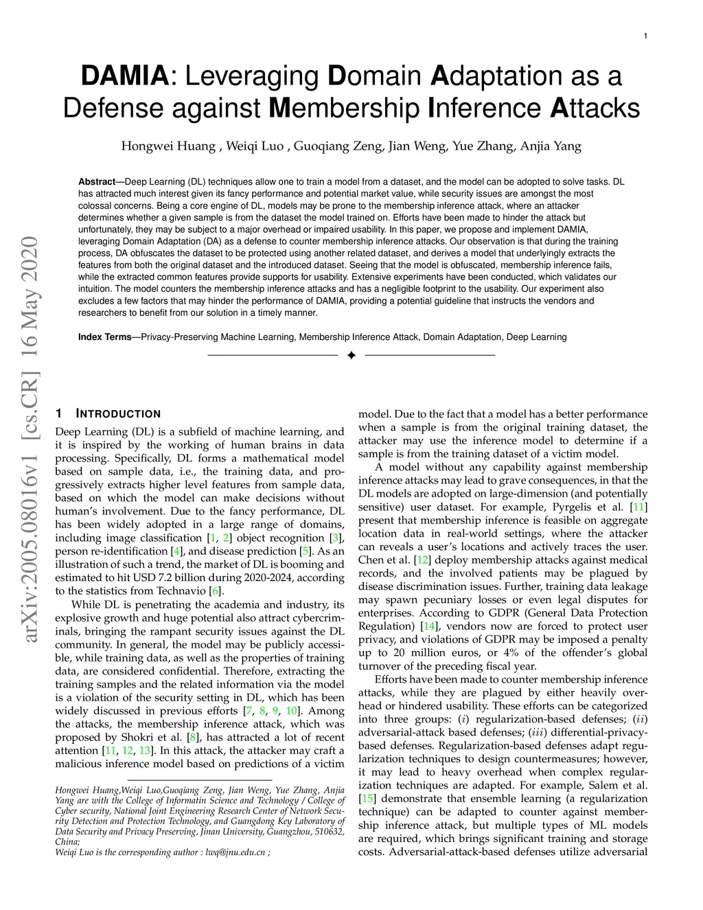 DAMIA: Leveraging Domain Adaptation as a Defense against Membership