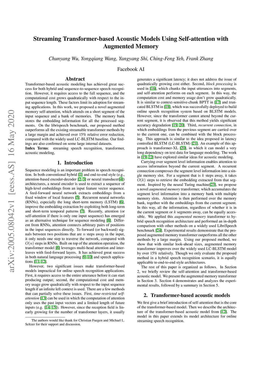 Transformer-based acoustic modeling has achieved great suc-cess for both hybrid and sequence-to-sequence speech recogni-tion. However, it requires access to the full sequence, and thecomputational cost grows quadratically with respect to the in-put sequence length. These factors limit its adoption for stream-ing applications. In this work, we proposed a novel augmentedmemory self-attention, which attends on a short segment of theinput sequence and a bank of memories. The memory bankstores the embedding information for all the processed seg-ments. On the librispeech benchmark, our proposed methodoutperforms all the existing streamable transformer methods bya large margin and achieved over 15% relative error reduction,compared with the widely used LC-BLSTM baseline. Our find-ings are also confirmed on some large internal datasets.