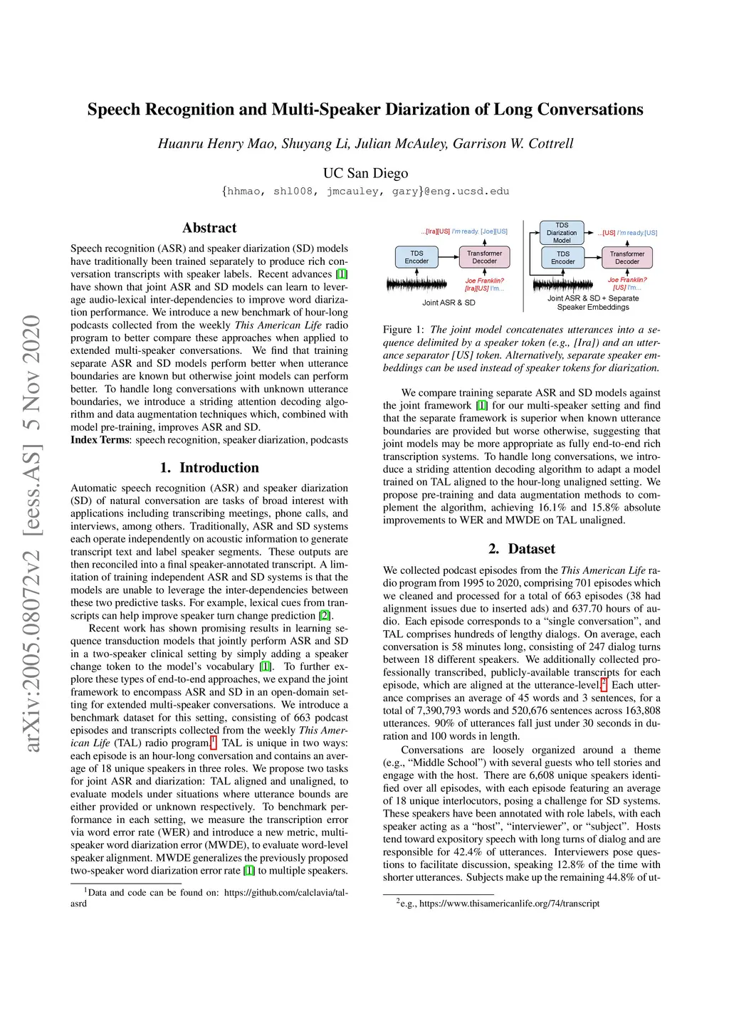 Speech recognition (ASR) and speaker diarization (SD) models have traditionally been trained separately to produce rich conversation transcripts with speaker labels. Recent advances have shown that joint ASR and SD models can learn to leverage audio-lexical inter-dependencies to improve word diarization performance. We introduce a new benchmark of hour-long podcasts collected from the weekly This American Life radio program to better compare these approaches when applied to extended multi-speaker conversations. We find that training separate ASR and SD models perform better when utterance boundaries are known but otherwise joint models can perform better. To handle long conversations with unknown utterance boundaries, we introduce a striding attention decoding algorithm and data augmentation techniques which, combined with model pre-training, improves ASR and SD.