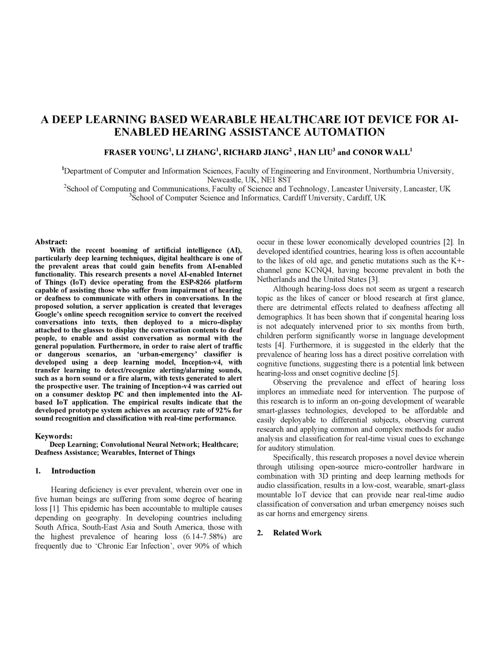 With the recent booming of artificial intelligence (AI), particularly deep learning techniques, digital healthcare is one of the prevalent areas that could gain benefits from AI-enabled functionality. This research presents a novel AI-enabled Internet of Things (IoT) device operating from the ESP-8266 platform capable of assisting those who suffer from impairment of hearing or deafness to communicate with others in conversations. In the proposed solution, a server application is created that leverages Google's online speech recognition service to convert the received conversations into texts, then deployed to a micro-display attached to the glasses to display the conversation contents to deaf people, to enable and assist conversation as normal with the general population. Furthermore, in order to raise alert of traffic or dangerous scenarios, an úrban-emergency' classifier is developed using a deep learning model, Inception-v4, with transfer learning to detect/recognize alerting/alarming sounds, such as a horn sound or a fire alarm, with texts generated to alert the prospective user. The training of Inception-v4 was carried out on a consumer desktop PC and then implemented into the AI based IoT application. The empirical results indicate that the developed prototype system achieves an accuracy rate of 92% for sound recognition and classification with real-time performance.