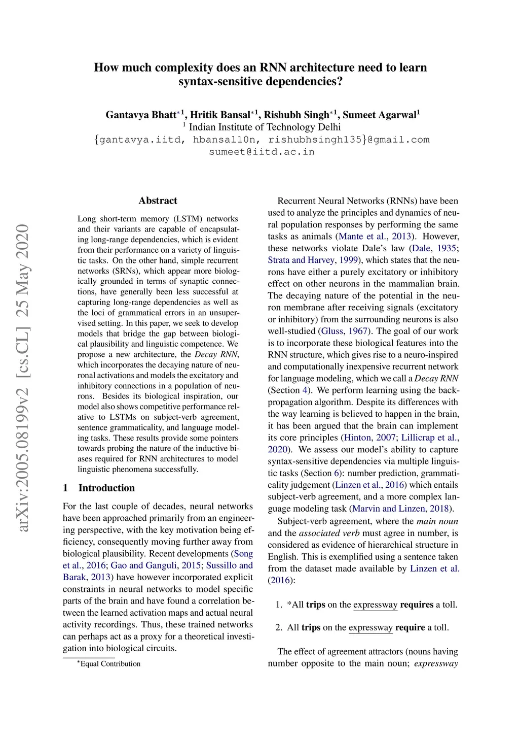 Long short-term memory (LSTM) networks and their variants are capable of encapsulating long-range dependencies, which is evident from their performance on a variety of linguistic tasks. On the other hand, simple recurrent networks (SRNs), which appear more biologically grounded in terms of synaptic connections, have generally been less successful at capturing long-range dependencies as well as the loci of grammatical errors in an unsupervised setting. In this paper, we seek to develop models that bridge the gap between biological plausibility and linguistic competence. We propose a new architecture, the Decay RNN, which incorporates the decaying nature of neuronal activations and models the excitatory and inhibitory connections in a population of neurons. Besides its biological inspiration, our model also shows competitive performance relative to LSTMs on subject-verb agreement, sentence grammaticality, and language modeling tasks. These results provide some pointers towards probing the nature of the inductive biases required for RNN architectures to model linguistic phenomena successfully.
