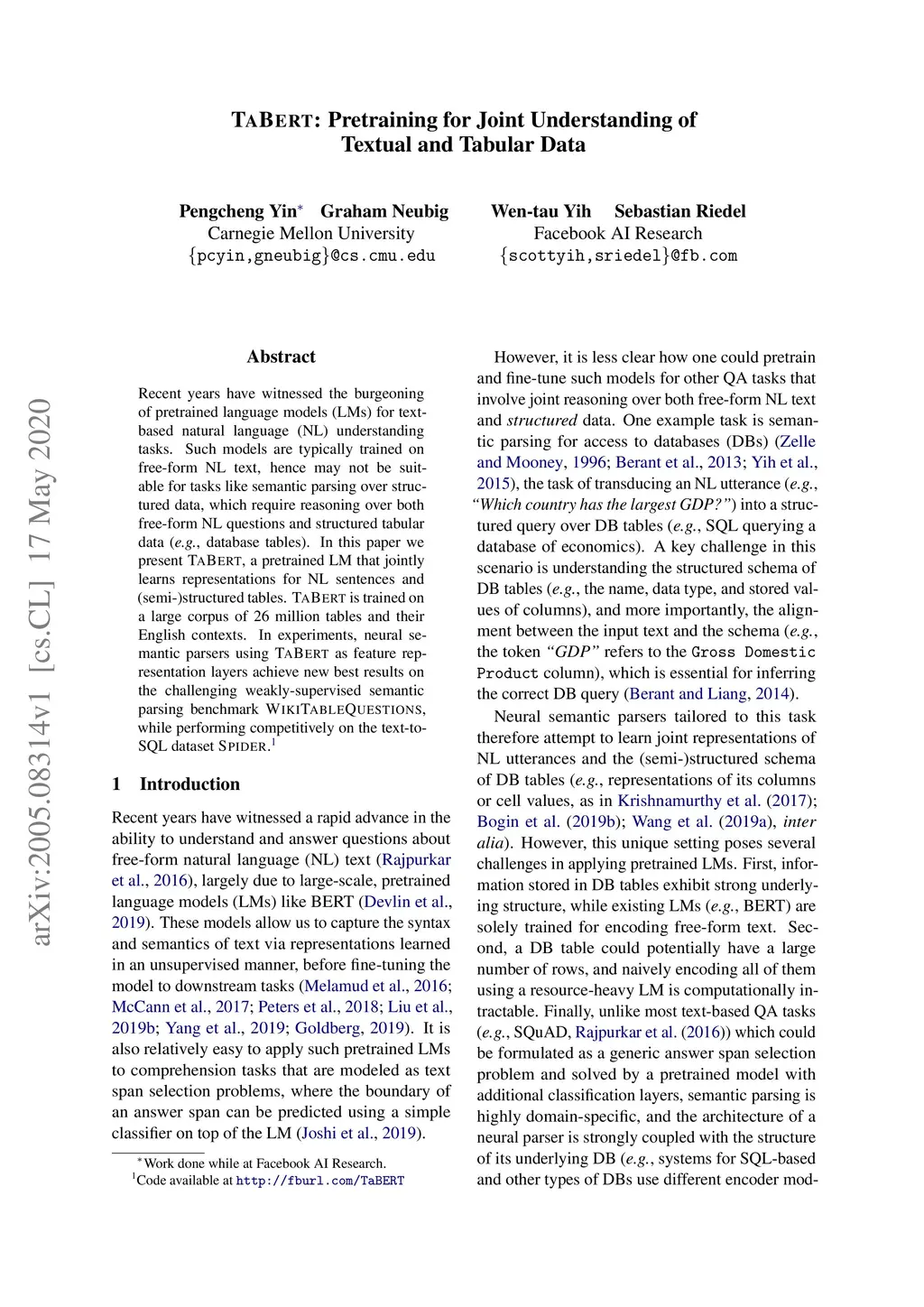 TaBERT: Pretraining for Joint Understanding of Textual and Tabular Data