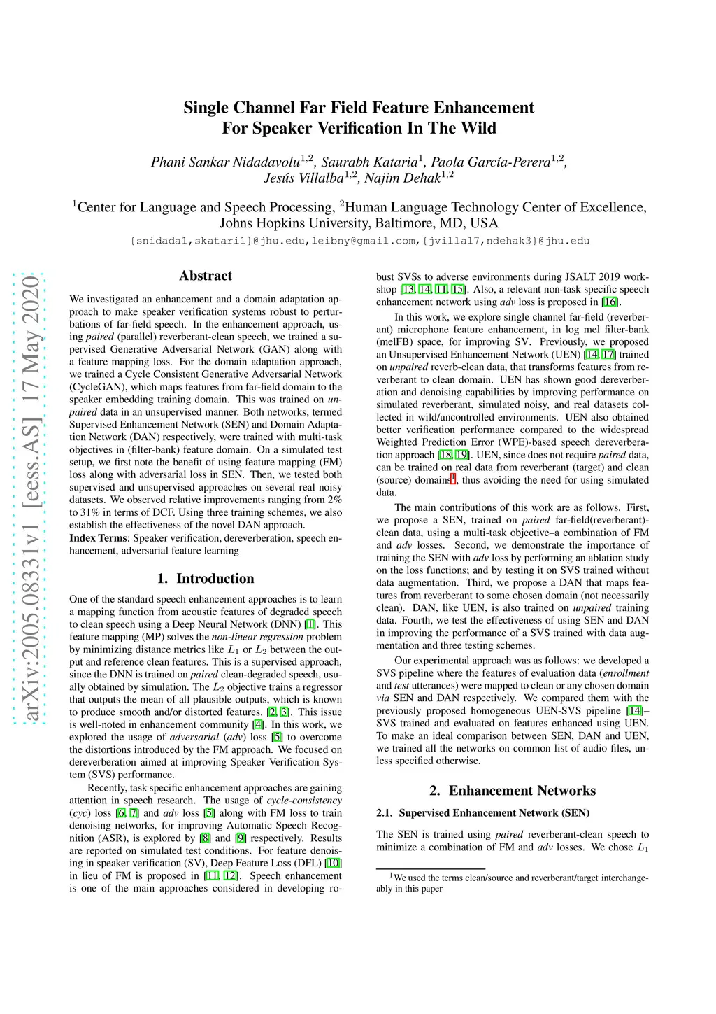 We investigated an enhancement and a domain adaptation approach to make speaker verification systems robust to perturbations of far-field speech. In the enhancement approach, using paired (parallel) reverberant-clean speech, we trained a supervised Generative Adversarial Network (GAN) along with a feature mapping loss. For the domain adaptation approach, we trained a Cycle Consistent Generative Adversarial Network (CycleGAN), which maps features from far-field domain to the speaker embedding training domain. This was trained on unpaired data in an unsupervised manner. Both networks, termed Supervised Enhancement Network (SEN) and Domain Adaptation Network (DAN) respectively, were trained with multi-task objectives in (filter-bank) feature domain. On a simulated test setup, we first note the benefit of using feature mapping (FM) loss along with adversarial loss in SEN. Then, we tested both supervised and unsupervised approaches on several real noisy datasets. We observed relative improvements ranging from 2% to 31% in terms of DCF. Using three training schemes, we also establish the effectiveness of the novel DAN approach.