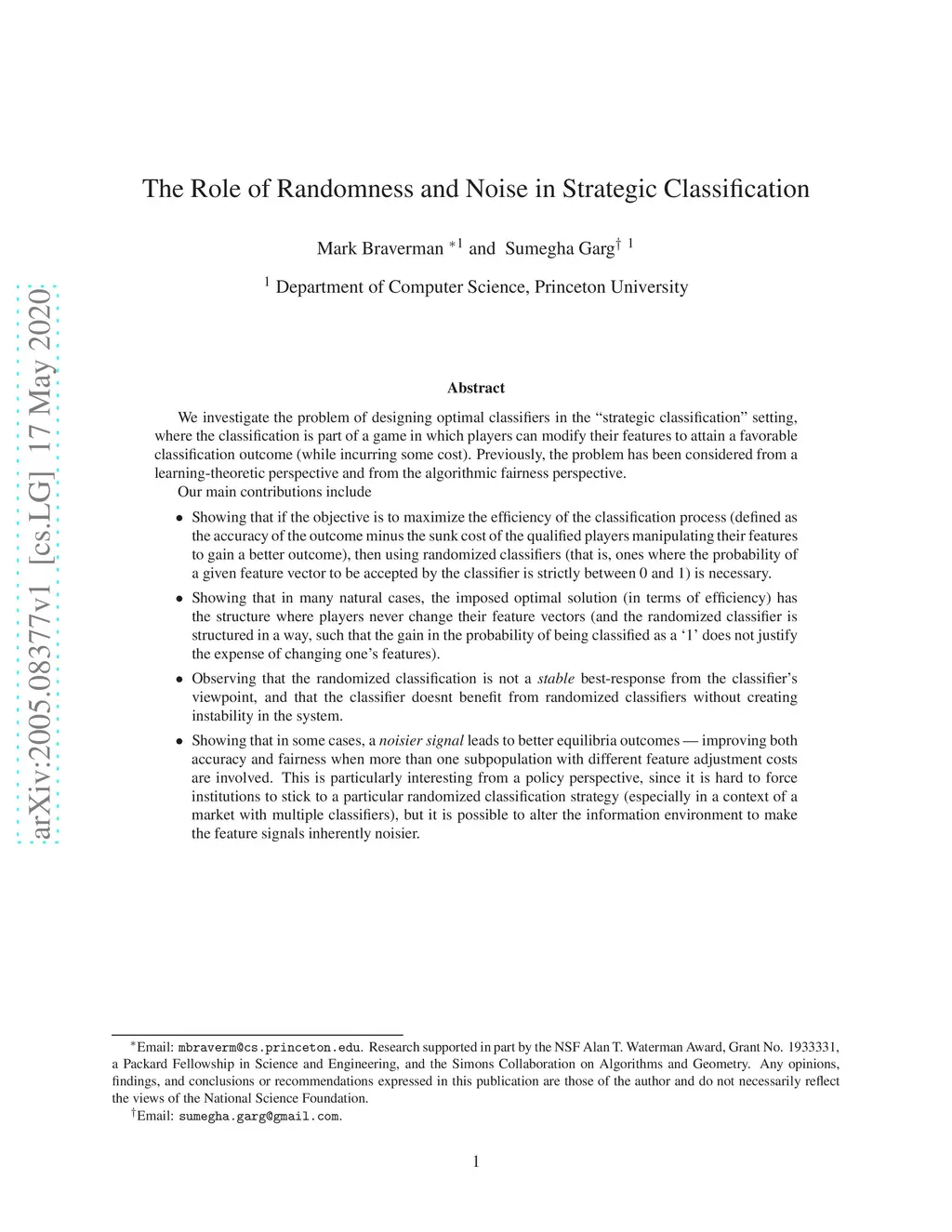 We investigate the problem of designing optimal classifiers in the strategic classification setting, where the classification is part of a game in which players can modify their features to attain a favorable classification outcome (while incurring some cost). Previously, the problem has been considered from a learning-theoretic perspective and from the algorithmic fairness perspective. Our main contributions include 1. Showing that if the objective is to maximize the efficiency of the classification process (defined as the accuracy of the outcome minus the sunk cost of the qualified players manipulating their features to gain a better outcome), then using randomized classifiers (that is, ones where the probability of a given feature vector to be accepted by the classifier is strictly between 0 and 1) is necessary. 2. Showing that in many natural cases, the imposed optimal solution (in terms of efficiency) has the structure where players never change their feature vectors (the randomized classifier is structured in a way, such that the gain in the probability of being classified as a 1 does not justify the expense of changing one's features). 3. Observing that the randomized classification is not a stable best-response from the classifier's viewpoint, and that the classifier doesn't benefit from randomized classifiers without creating instability in the system. 4. Showing that in some cases, a noisier signal leads to better equilibria outcomes -- improving both accuracy and fairness when more than one subpopulation with different feature adjustment costs are involved. This is interesting from a policy perspective, since it is hard to force institutions to stick to a particular randomized classification strategy (especially in a context of a market with multiple classifiers), but it is possible to alter the information environment to make the feature signals inherently noisier.