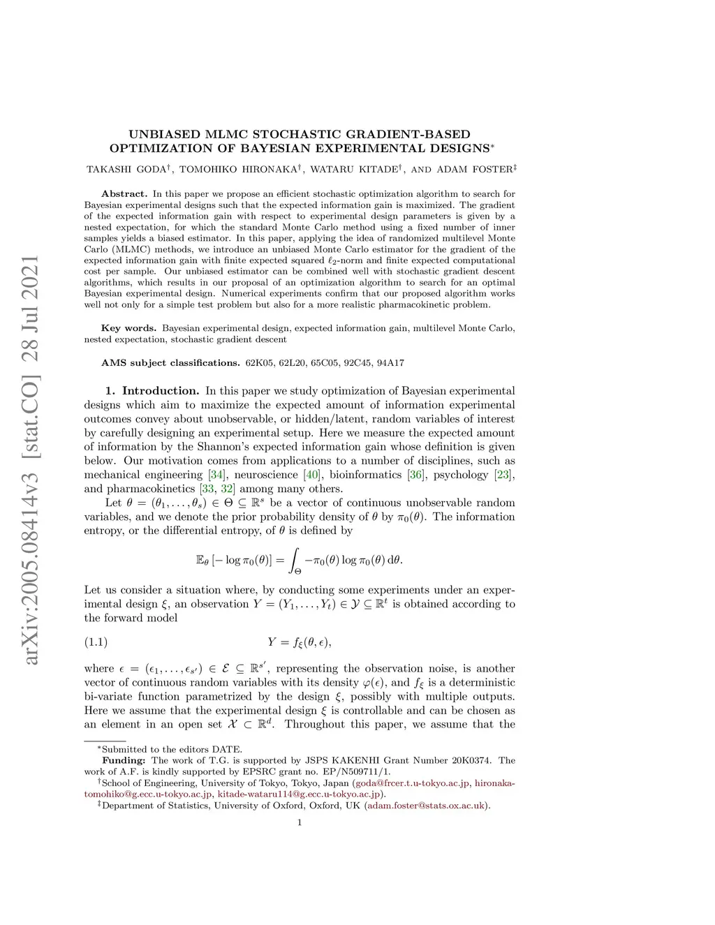 In this paper we propose an efficient stochastic optimization algorithm to search for Bayesian experimental designs such that the expected information gain is maximized. The gradient of the expected information gain with respect to experimental design parameters is given by a nested expectation, for which the standard Monte Carlo method using a fixed number of inner samples yields a biased estimator. In this paper, applying the idea of randomized multilevel Monte Carlo (MLMC) methods, we introduce an unbiased Monte Carlo estimator for the gradient of the expected information gain with finite expected squared -norm and finite expected computational cost per sample. Our unbiased estimator can be combined well with stochastic gradient descent algorithms, which results in our proposal of an optimization algorithm to search for an optimal Bayesian experimental design. Numerical experiments confirm that our proposed algorithm works well not only for a simple test problem but also for a more realistic pharmacokinetic problem.
