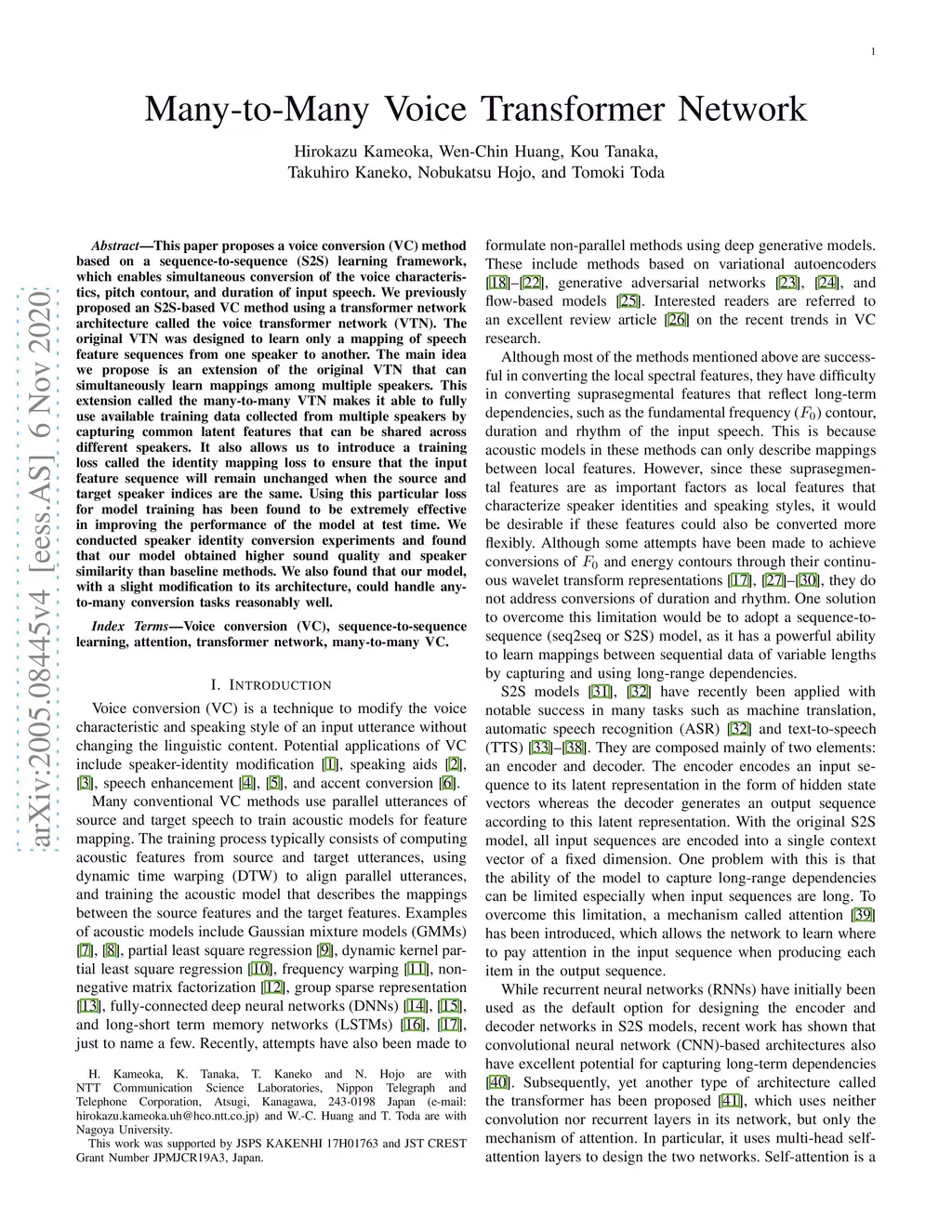 This paper proposes a voice conversion (VC) method based on a sequence-to-sequence (S2S) learning framework, which enables simultaneous conversion of the voice characteristics, pitch contour, and duration of input speech. We previously proposed an S2S-based VC method using a transformer network architecture called the voice transformer network (VTN). The original VTN was designed to learn only a mapping of speech feature sequences from one speaker to another. The main idea we propose is an extension of the original VTN that can simultaneously learn mappings among multiple speakers. This extension called the many-to-many VTN makes it able to fully use available training data collected from multiple speakers by capturing common latent features that can be shared across different speakers. It also allows us to introduce a training loss called the identity mapping loss to ensure that the input feature sequence will remain unchanged when the source and target speaker indices are the same. Using this particular loss for model training has been found to be extremely effective in improving the performance of the model at test time. We conducted speaker identity conversion experiments and found that our model obtained higher sound quality and speaker similarity than baseline methods. We also found that our model, with a slight modification to its architecture, could handle any-to-many conversion tasks reasonably well.