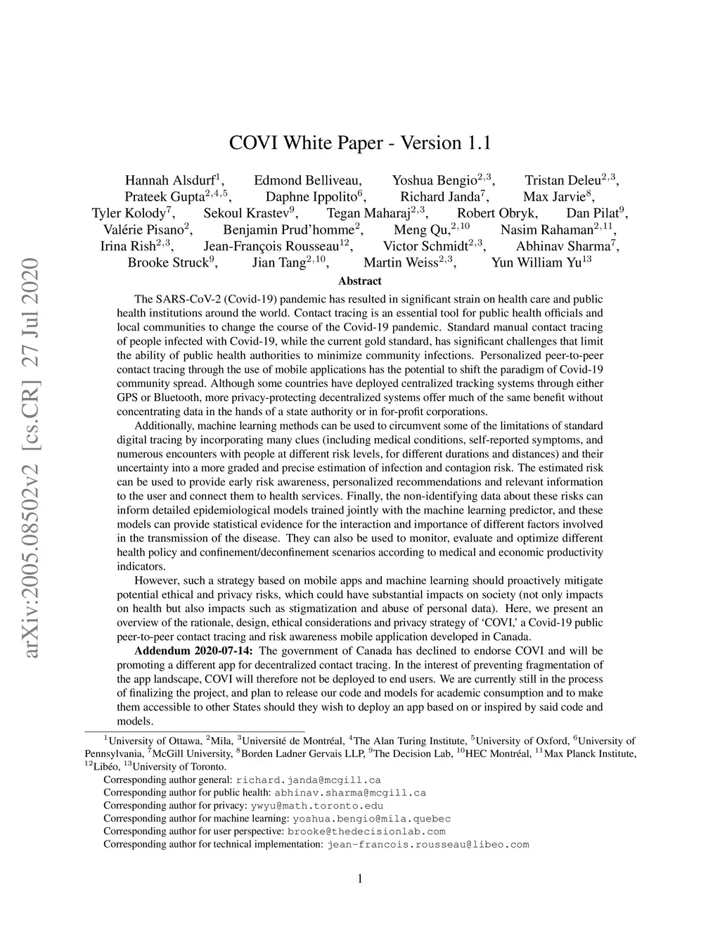 The SARS-CoV-2 (Covid-19) pandemic has caused significant strain on public health institutions around the world. Contact tracing is an essential tool to change the course of the Covid-19 pandemic. Manual contact tracing of Covid-19 cases has significant challenges that limit the ability of public health authorities to minimize community infections. Personalized peer-to-peer contact tracing through the use of mobile apps has the potential to shift the paradigm. Some countries have deployed centralized tracking systems, but more privacy-protecting decentralized systems offer much of the same benefit without concentrating data in the hands of a state authority or for-profit corporations. Machine learning methods can circumvent some of the limitations of standard digital tracing by incorporating many clues and their uncertainty into a more graded and precise estimation of infection risk. The estimated risk can provide early risk awareness, personalized recommendations and relevant information to the user. Finally, non-identifying risk data can inform epidemiological models trained jointly with the machine learning predictor. These models can provide statistical evidence for the importance of factors involved in disease transmission. They can also be used to monitor, evaluate and optimize health policy and (de)confinement scenarios according to medical and economic productivity indicators. However, such a strategy based on mobile apps and machine learning should proactively mitigate potential ethical and privacy risks, which could have substantial impacts on society (not only impacts on health but also impacts such as stigmatization and abuse of personal data). Here, we present an overview of the rationale, design, ethical considerations and privacy strategy of `COVI,' a Covid-19 public peer-to-peer contact tracing and risk awareness mobile application developed in Canada.