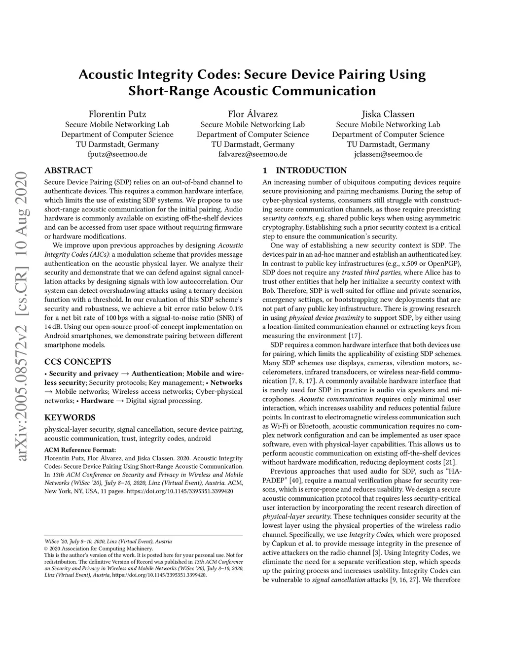 Acoustic Integrity Codes: Secure Device Pairing Using Short-Range