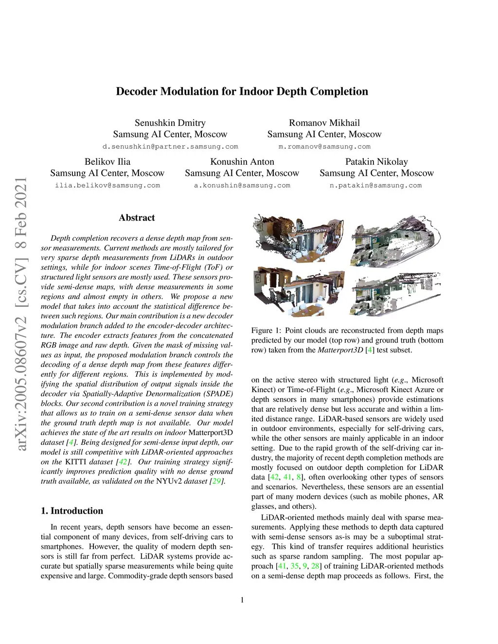 Depth completion recovers a dense depth map from sensor measurements. Current methods are mostly tailored for very sparse depth measurements from LiDARs in outdoor settings, while for indoor scenes Time-of-Flight (ToF) or structured light sensors are mostly used. These sensors provide semi-dense maps, with dense measurements in some regions and almost empty in others. We propose a new model that takes into account the statistical difference between such regions. Our main contribution is a new decoder modulation branch added to the encoder-decoder architecture. The encoder extracts features from the concatenated RGB image and raw depth. Given the mask of missing values as input, the proposed modulation branch controls the decoding of a dense depth map from these features differently for different regions. This is implemented by modifying the spatial distribution of output signals inside the decoder via Spatially-Adaptive Denormalization (SPADE) blocks. Our second contribution is a novel training strategy that allows us to train on a semi-dense sensor data when the ground truth depth map is not available. Our model achieves the state of the art results on indoor Matterport3D dataset. Being designed for semi-dense input depth, our model is still competitive with LiDAR-oriented approaches on the KITTI dataset. Our training strategy significantly improves prediction quality with no dense ground truth available, as validated on the NYUv2 dataset.
