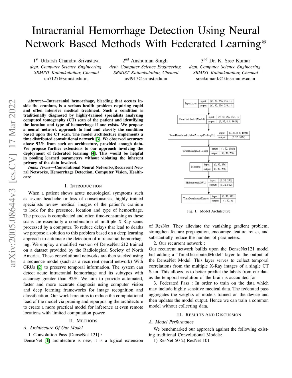 Intracranial hemorrhage, bleeding that occurs inside the cranium, is a serious health problem requiring rapid and often intensive medical treatment. Such a condition is traditionally diagnosed by highly-trained specialists analyzing computed tomography (CT) scan of the patient and identifying the location and type of hemorrhage if one exists. We propose a neural network approach to find and classify the condition based upon the CT scan. The model architecture implements a time distributed convolutional network. We observed accuracy above 92% from such an architecture, provided enough data. We propose further extensions to our approach involving the deployment of federated learning. This would be helpful in pooling learned parameters without violating the inherent privacy of the data involved.