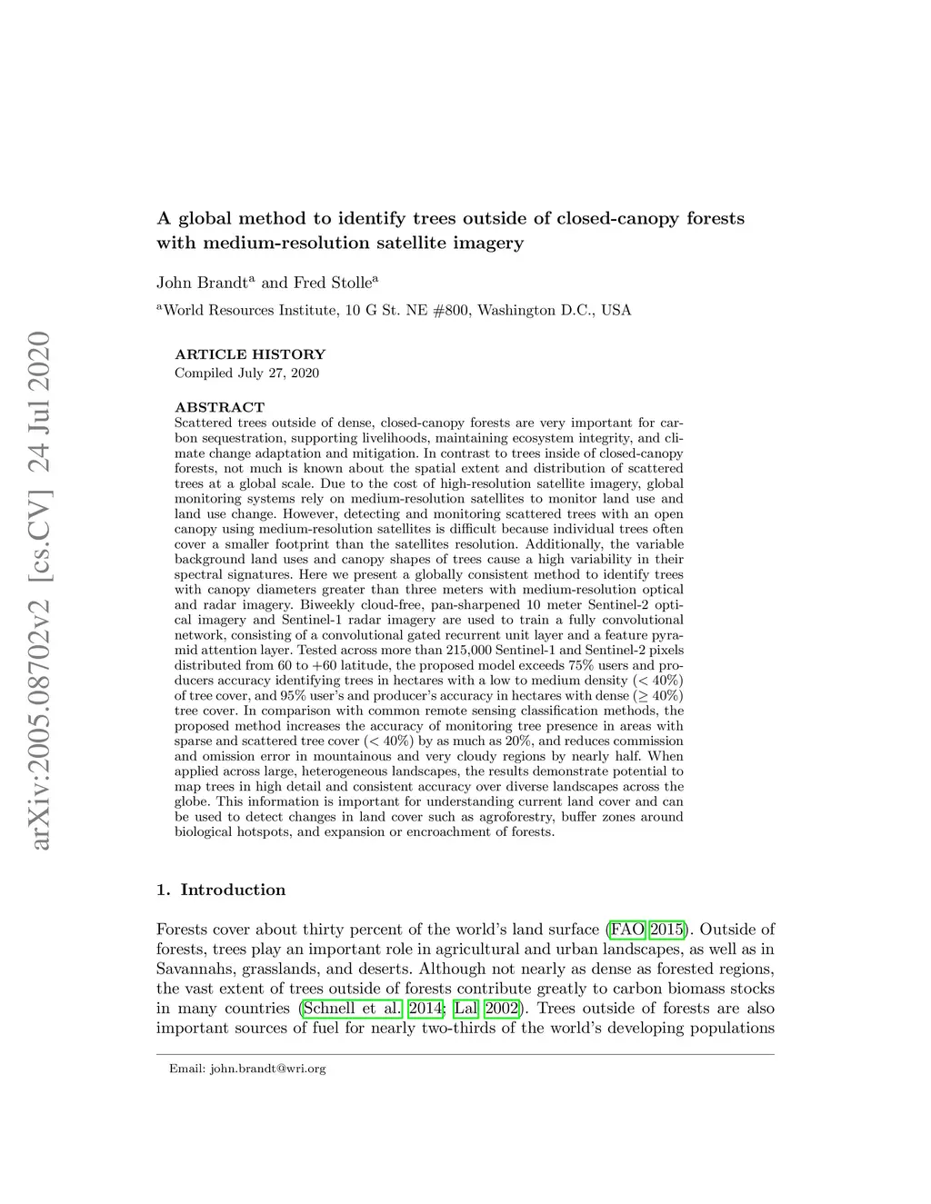 Scattered trees outside of dense, closed-canopy forests are very important for carbon sequestration, supporting livelihoods, maintaining ecosystem integrity, and climate change adaptation and mitigation. In contrast to trees inside of closed-canopy forests, not much is known about the spatial extent and distribution of scattered trees at a global scale. Due to the cost of high-resolution satellite imagery, global monitoring systems rely on medium-resolution satellites to monitor land use. Here we present a globally consistent method to identify trees with canopy diameters greater than three meters with medium-resolution optical and radar imagery. Biweekly cloud-free, pan-sharpened 10 meter Sentinel-2 optical imagery and Sentinel-1 radar imagery are used to train a fully convolutional network, consisting of a convolutional gated recurrent unit layer and a feature pyramid attention layer. Tested across more than 215,000 Sentinel-1 and Sentinel-2 pixels distributed from -60 to +60 latitude, the proposed model exceeds 75% user's and producer's accuracy identifying trees in hectares with a low to medium density (less than 40%) of tree cover, and 95% user's and producer's accuracy in hectares with dense (greater than 40%) tree cover. The proposed method increases the accuracy of monitoring tree presence in areas with sparse and scattered tree cover (less than 40%) by as much as 20%, and reduces commission and omission error in mountainous and very cloudy regions by nearly half. When applied across large, heterogeneous landscapes, the results demonstrate potential to map trees in high detail and accuracy over diverse landscapes across the globe. This information is important for understanding current land cover and can be used to detect changes in land cover such as agroforestry, buffer zones around biological hotspots, and expansion or encroachment of forests.