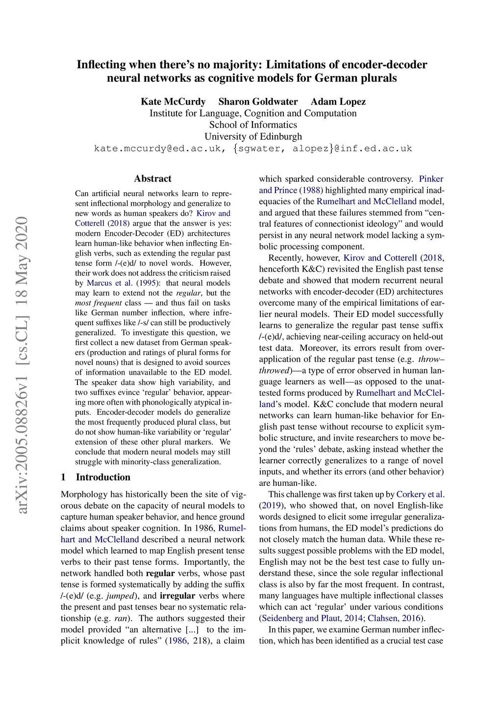 Can artificial neural networks learn to represent inflectional morphology and generalize to new words as human speakers do? Kirov and Cotterell (2018) argue that the answer is yes: modern Encoder-Decoder (ED) architectures learn human-like behavior when inflecting English verbs, such as extending the regular past tense form -(e)d to novel words. However, their work does not address the criticism raised by Marcus et al. (1995): that neural models may learn to extend not the regular, but the most frequent class -- and thus fail on tasks like German number inflection, where infrequent suffixes like -s can still be productively generalized. To investigate this question, we first collect a new dataset from German speakers (production and ratings of plural forms for novel nouns) that is designed to avoid sources of information unavailable to the ED model. The speaker data show high variability, and two suffixes evince 'regular' behavior, appearing more often with phonologically atypical inputs. Encoder-decoder models do generalize the most frequently produced plural class, but do not show human-like variability or 'regular' extension of these other plural markers. We conclude that modern neural models may still struggle with minority-class generalization.