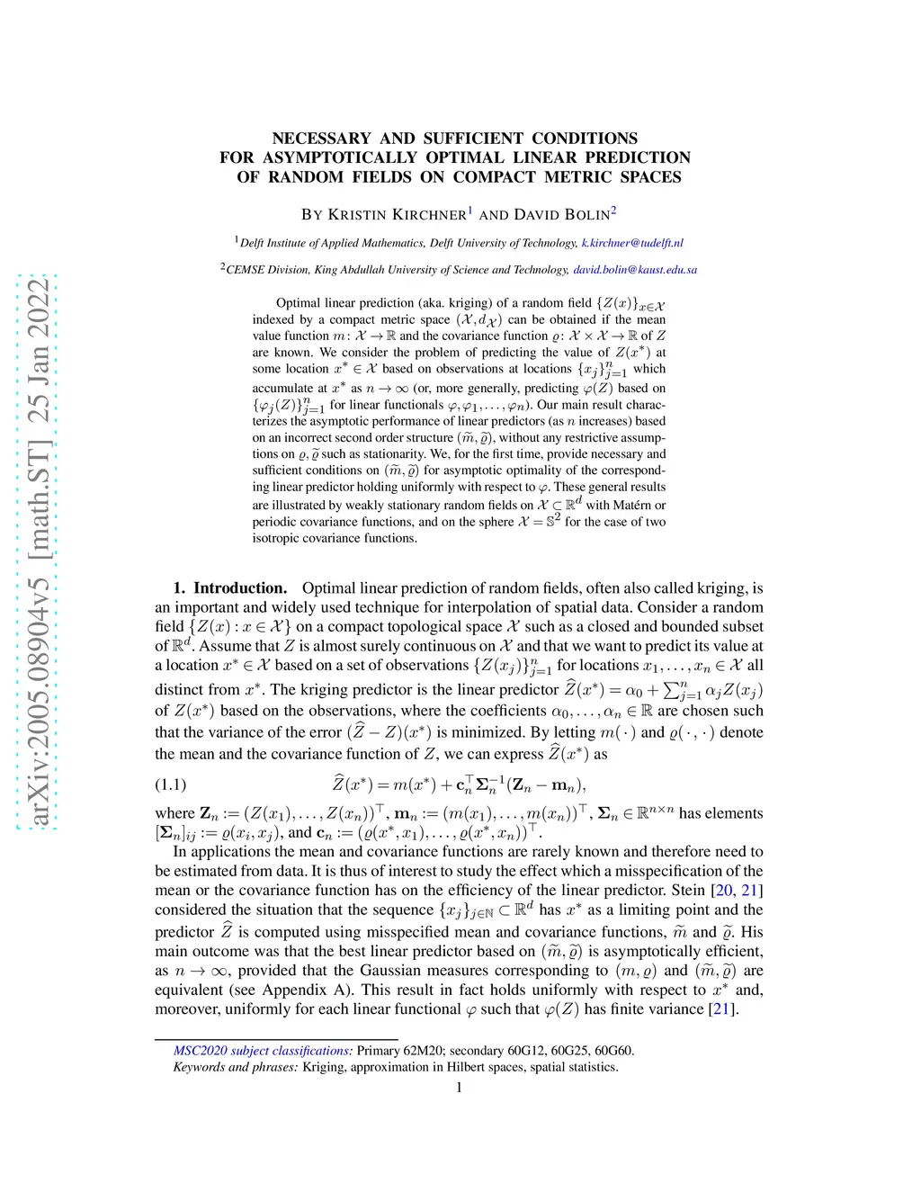 Optimal linear prediction (also known as kriging) of a random field indexed by a compact metric space can be obtained if the mean value function and the covariance function of are known. We consider the problem of predicting the value of at some location based on observations at locations which accumulate at as (or, more generally, predicting based on for linear functionals ). Our main result characterizes the asymptotic performance of linear predictors (as increases) based on an incorrect second order structure , without any restrictive assumptions on such as stationarity. We, for the first time, provide necessary and sufficient conditions on for asymptotic optimality of the corresponding linear predictor holding uniformly with respect to . These general results are illustrated by weakly stationary random fields on with Mat\'ern or periodic covariance functions, and on the sphere for the case of two isotropic covariance functions.