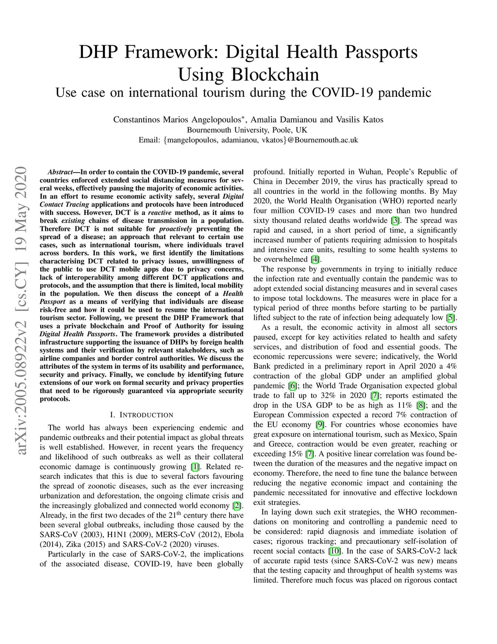 In order to contain the COVID-19 pandemic, several countries enforced extended social distancing measures for several weeks, effectively pausing the majority of economic activities. In an effort to resume economic activity safely, several Digital Contact Tracing applications and protocols have been introduced with success. However, DCT is a reactive method, as it aims to break existing chains of disease transmission in a population. Therefore DCT is not suitable for proactively preventing the spread of a disease; an approach that relevant to certain use cases, such as international tourism, where individuals travel across borders. In this work, we first identify the limitations characterising DCT related to privacy issues, unwillingness of the public to use DCT mobile apps due to privacy concerns, lack of interoperability among different DCT applications and protocols, and the assumption that there is limited, local mobility in the population. We then discuss the concept of a Health Passport as a means of verifying that individuals are disease risk-free and how it could be used to resume the international tourism sector. Following, we present the DHP Framework that uses a private blockchain and Proof of Authority for issuing Digital Health Passports. The framework provides a distributed infrastructure supporting the issuance of DHPs by foreign health systems and their verification by relevant stakeholders, such as airline companies and border control authorities. We discuss the attributes of the system in terms of its usability and performance, security and privacy. Finally, we conclude by identifying future extensions of our work on formal security and privacy properties that need to be rigorously guaranteed via appropriate security protocols.