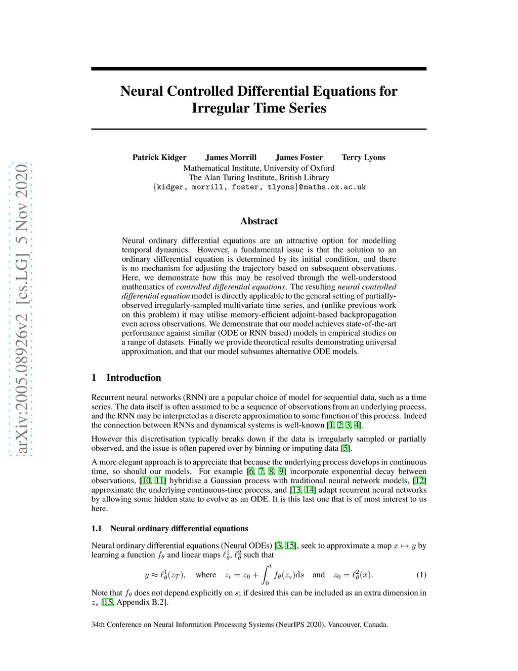 Neural ordinary differential equations are an attractive option for modelling temporal dynamics. However, a fundamental issue is that the solution to an ordinary differential equation is determined by its initial condition, and there is no mechanism for adjusting the trajectory based on subsequent observations. Here, we demonstrate how this may be resolved through the well-understood mathematics of \emph{controlled differential equations}. The resulting \emph{neural controlled differential equation} model is directly applicable to the general setting of partially-observed irregularly-sampled multivariate time series, and (unlike previous work on this problem) it may utilise memory-efficient adjoint-based backpropagation even across observations. We demonstrate that our model achieves state-of-the-art performance against similar (ODE or RNN based) models in empirical studies on a range of datasets. Finally we provide theoretical results demonstrating universal approximation, and that our model subsumes alternative ODE models.