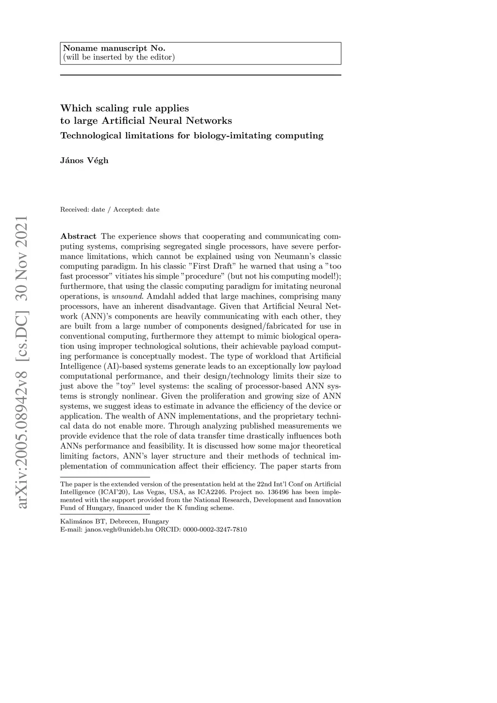 The experience shows that cooperating and communicating computing systems, comprising segregated single processors, have severe performance limitations. In his classic "First Draft" von Neumann warned that using a "too fast processor" vitiates his simple "procedure" (but not his computing model!); furthermore, that using the classic computing paradigm for imitating neuronal operations, is unsound. Amdahl added that large machines, comprising many processors, have an inherent disadvantage. Given that ANN's components are heavily communicating with each other, they are built from a large number of components designed/fabricated for use in conventional computing, furthermore they attempt to mimic biological operation using improper technological solutions, their achievable payload computing performance is conceptually modest. The type of workload that AI-based systems generate leads to an exceptionally low payload computational performance, and their design/technology limits their size to just above the "toy" level systems: the scaling of processor-based ANN systems is strongly nonlinear. Given the proliferation and growing size of ANN systems, we suggest ideas to estimate in advance the efficiency of the device or application. Through analyzing published measurements we provide evidence that the role of data transfer time drastically influences both ANNs performance and feasibility. It is discussed how some major theoretical limiting factors, ANN's layer structure and their methods of technical implementation of communication affect their efficiency. The paper starts from von Neumann's original model, without neglecting the transfer time apart from processing time; derives an appropriate interpretation and handling for Amdahl's law. It shows that, in that interpretation, Amdahl's Law correctly describes ANNs.